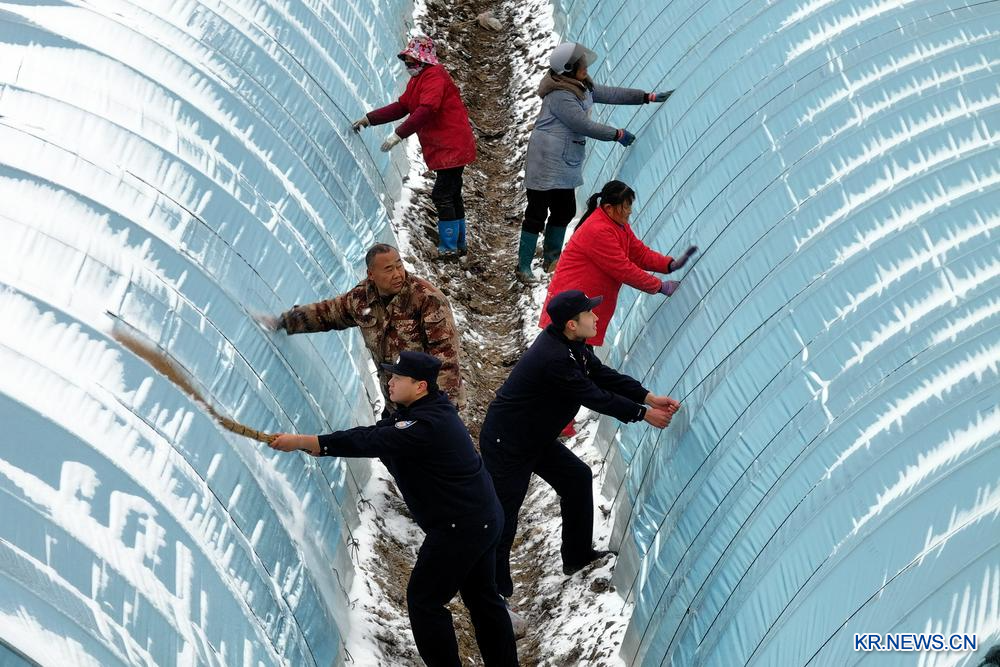 19일 장쑤(江蘇)성 바오잉(寶應)현 첸좡(錢莊)촌에서 비닐하우스 위의 눈을 치우는 현지 파출소 민경들과 농민들. 2026.1.20