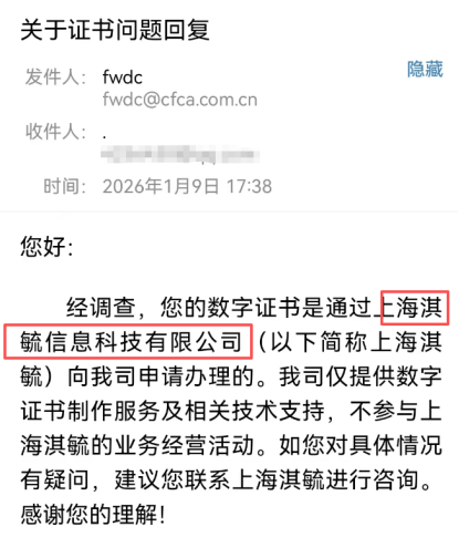 1月13日,大众新闻记者以用户身份致电中金公司,询问同一签名主体在同一机构是否同期只能持有一个签名。在经过了反复确认后,1月16日下午,中金公司客服组相关负责人表示,上述事件中涉及的电子签名,可以同时认证多个电子签名。