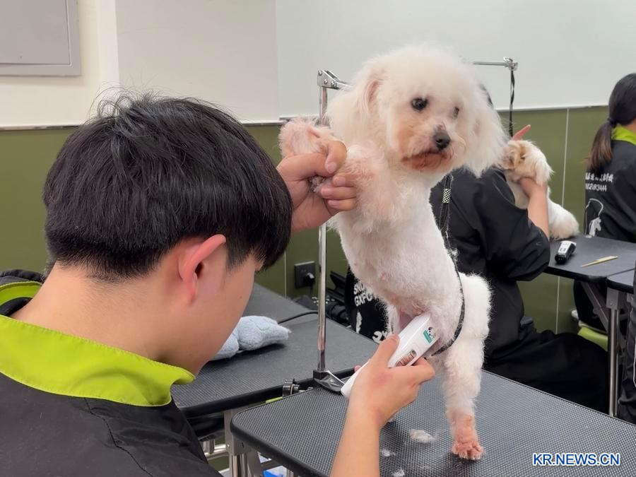 러러(樂樂)반려동물 미용∙훈련학교에서 반려견을 미용하고 있는 미용사. (사진/신화통신)