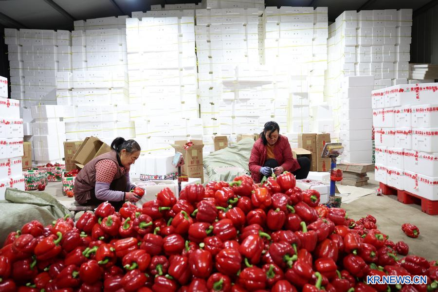산둥(山東)성 서우광(壽光)시 둥화(東華)채소전문합작사 직원들이 파프리카를 포장해 상자에 담고 있다. (취재원 제공)
