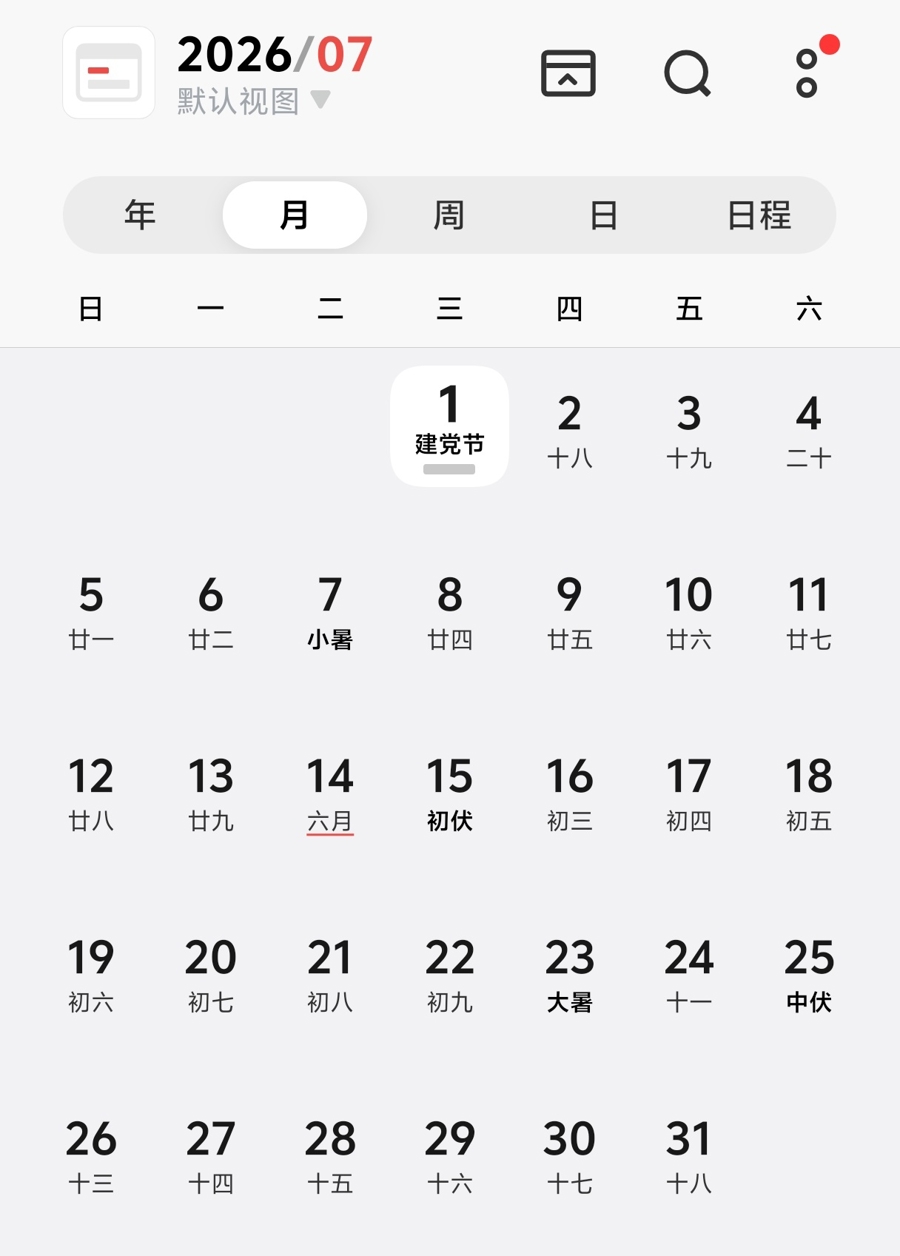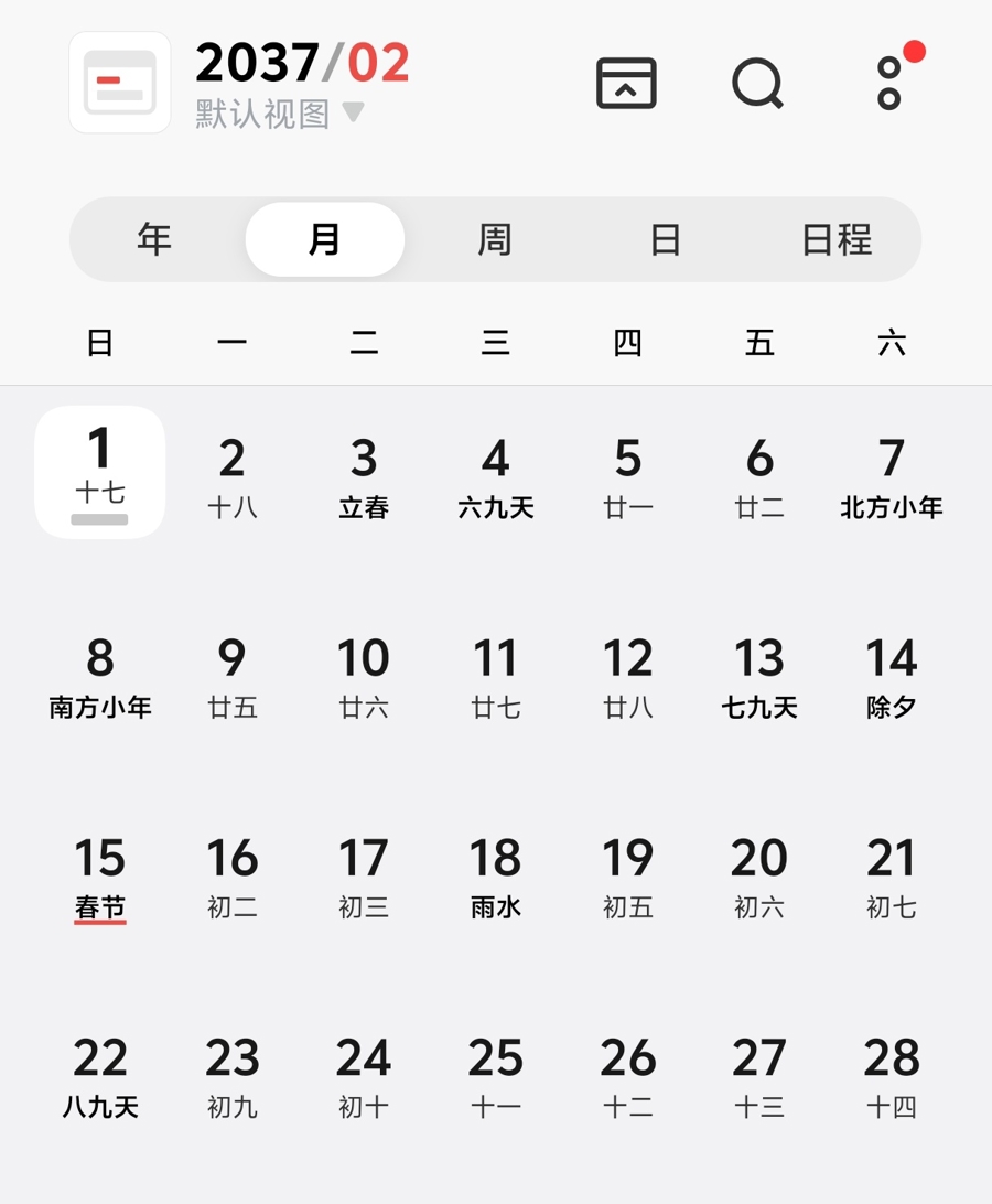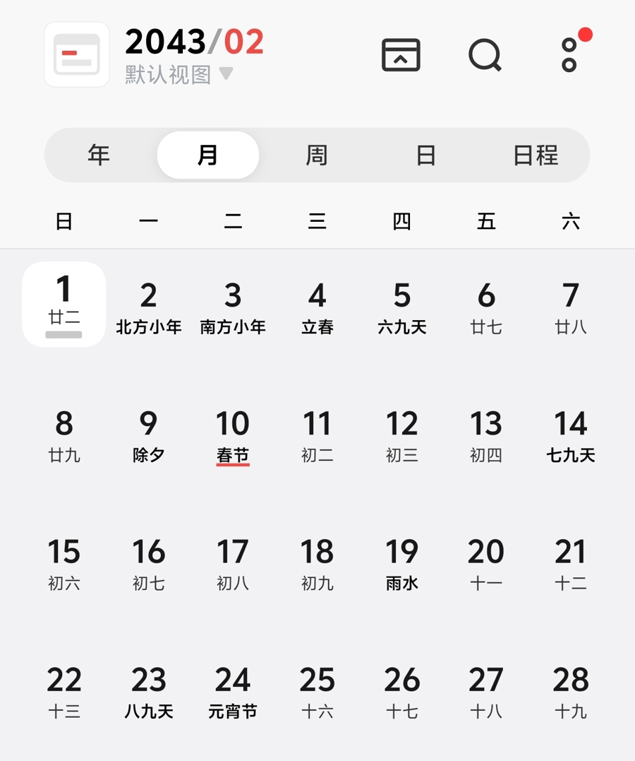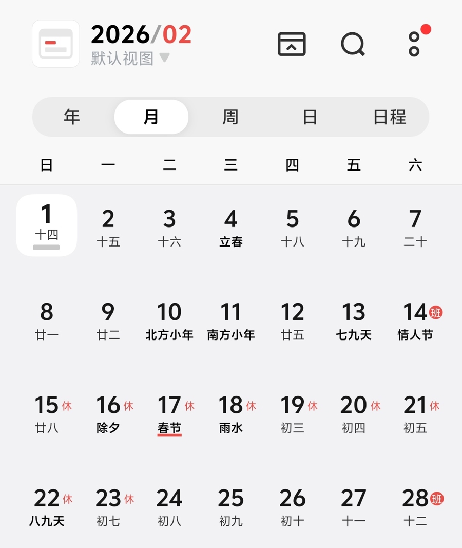 某手机自带日历显示的2026年2月(截屏)