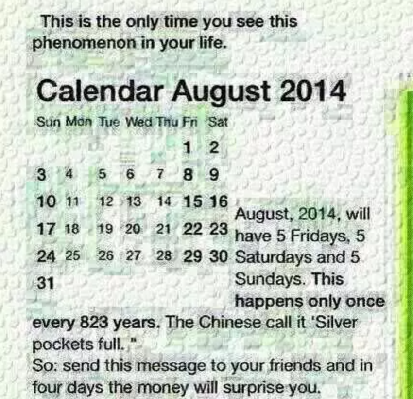 进一步调查还发现,这条消息不是第一次出现,每隔数年就有一个新版本。例如,2011年时,曾有消息称当年10月是“特殊月”“每隔823年才会出现一次”,因为当年10月的周五、六、日各有5个;2014年,又有消息称当年8月是“特殊月”,理由同样是周五、六、日各有5个……这些“特殊月”也被冠以“幸运月”“钱袋月”等名目,要求看到信息的人转发。当然,这些假消息也都被澄清了。