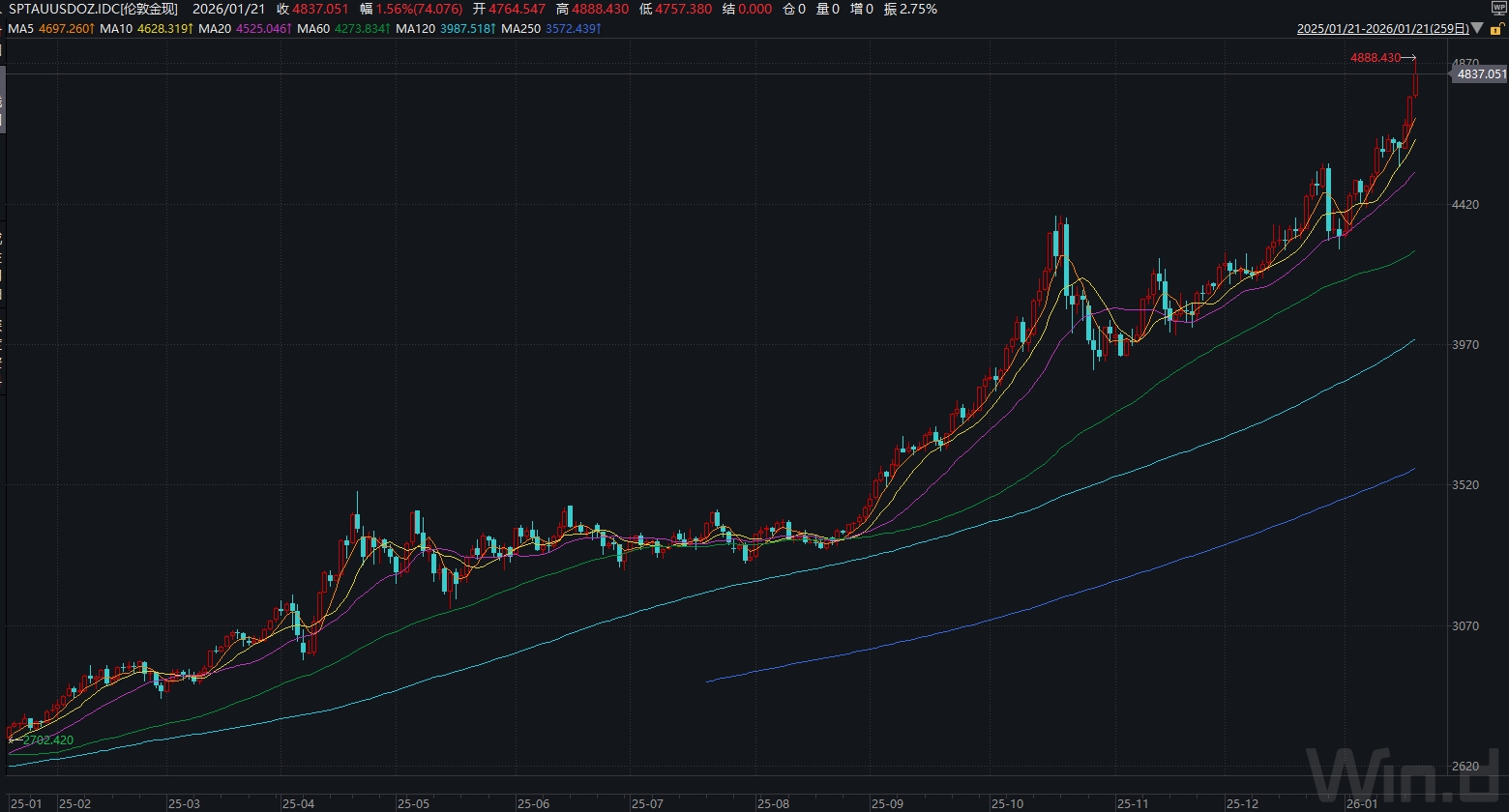 国际贵金属市场继续高歌猛进,黄金、白银价格双双上演暴涨行情,接连刷新历史新高,1月21日,“现货黄金史上首次涨破4800美元关口” 相关话题迅速引爆热搜,成为市场焦点。