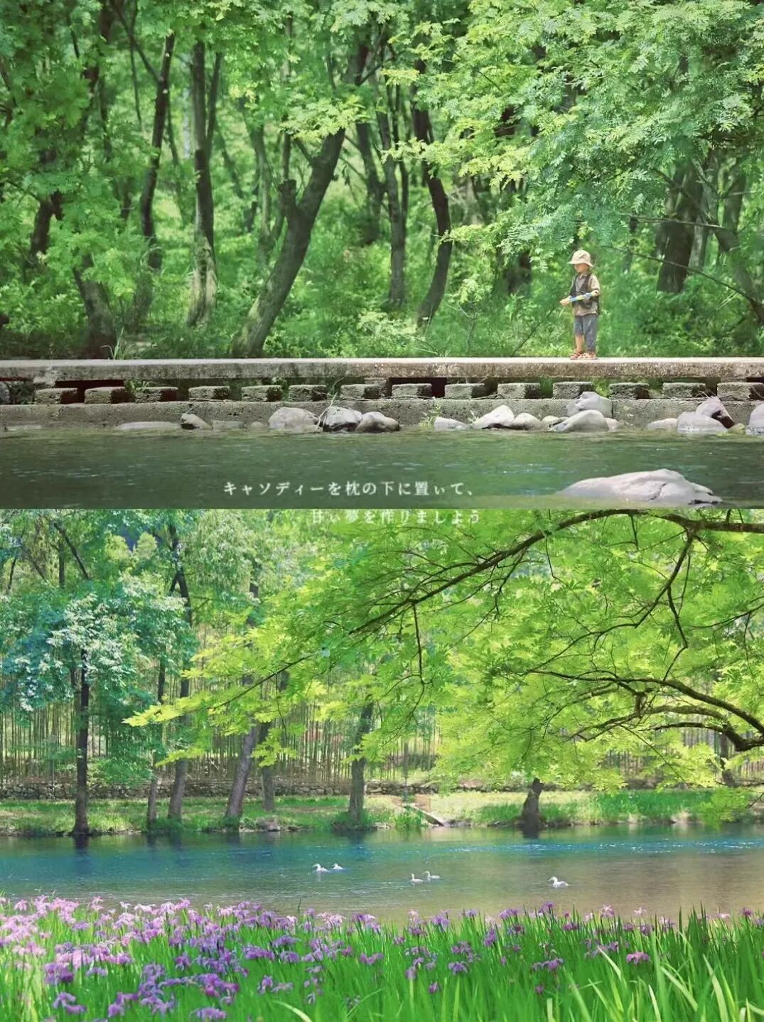 绿草地、蓝湖、青山、碧天,宛如宫崎骏的漫画。