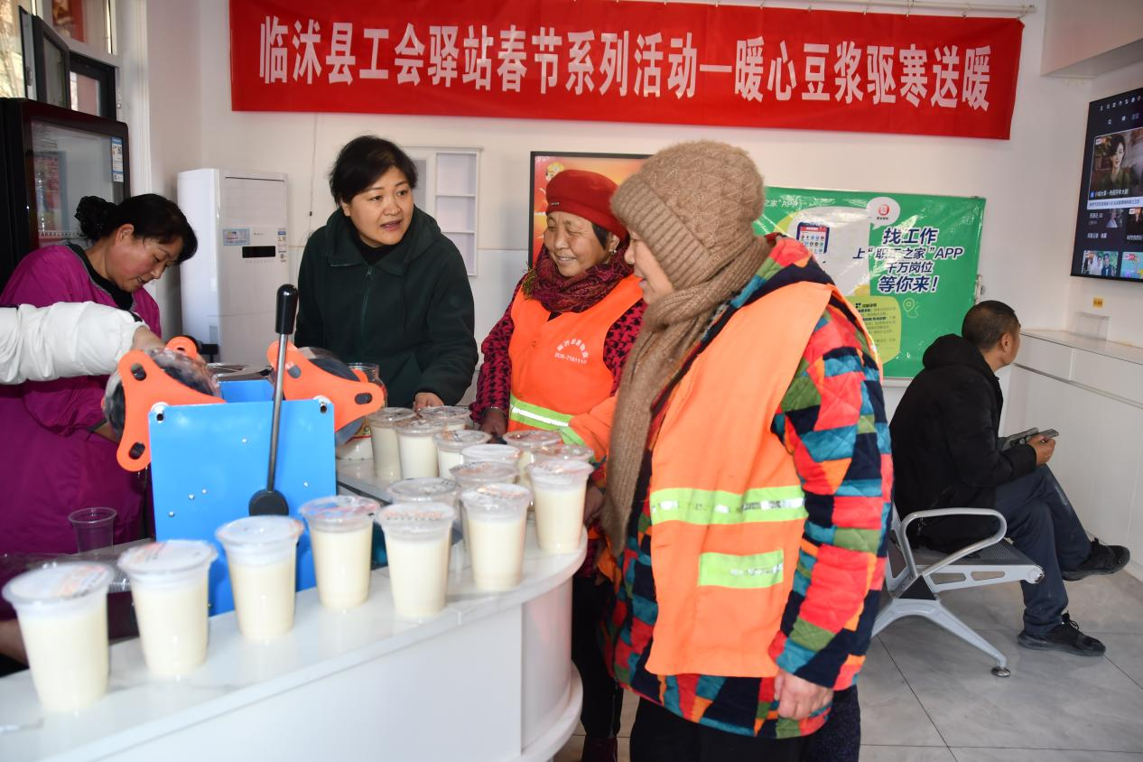“天虽冷,这杯热豆浆下肚,心里暖和得很!”环卫工人李大妈接过志愿者递上的早餐,笑容满面。她表示,工会驿站就像个“暖心港湾”,不仅平时能歇脚、充电,冬天还特意供应热豆浆,让人倍感贴心。