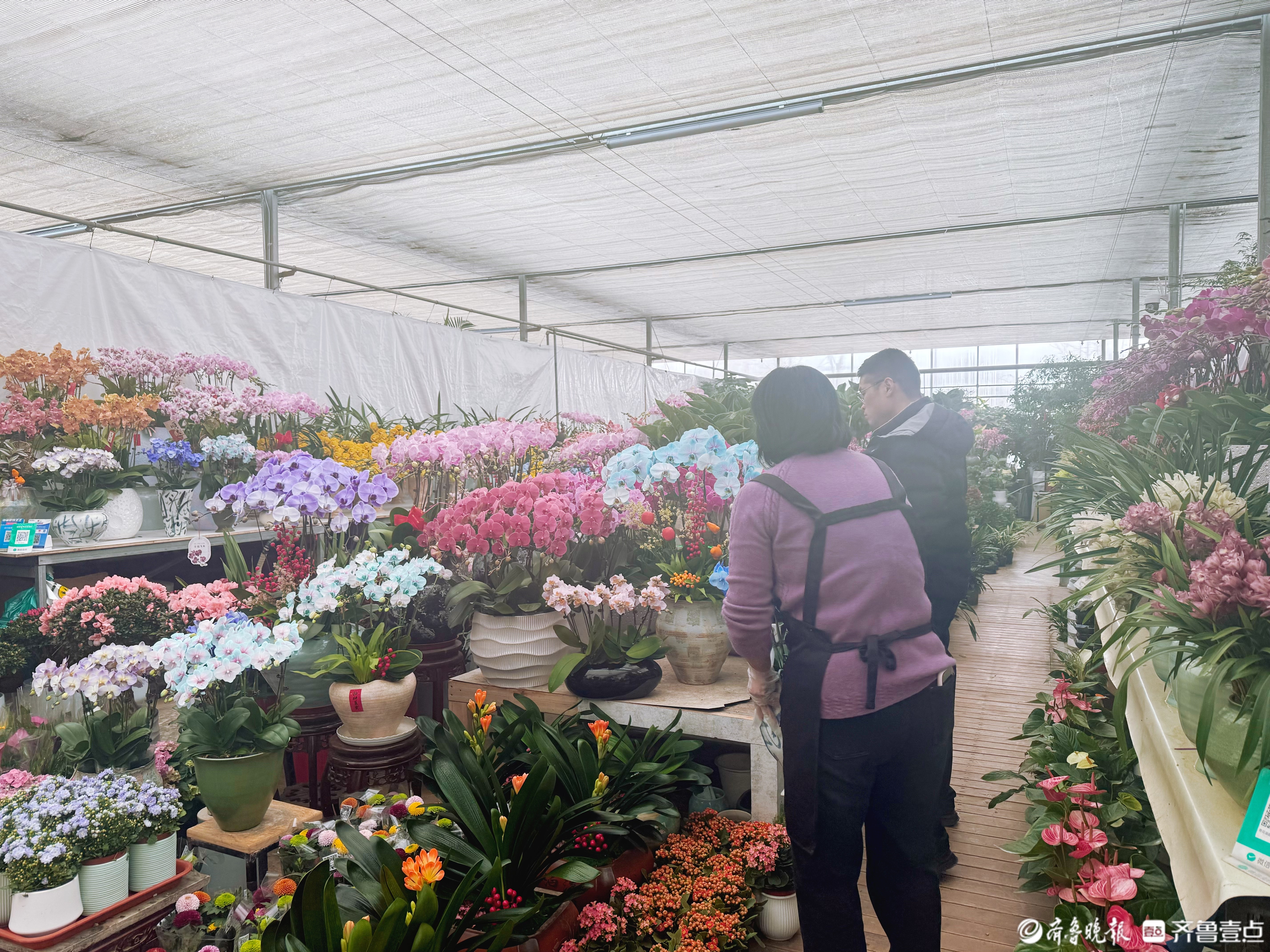 顾客在济南百合花卉展销市场某花卉店铺选购年宵花
