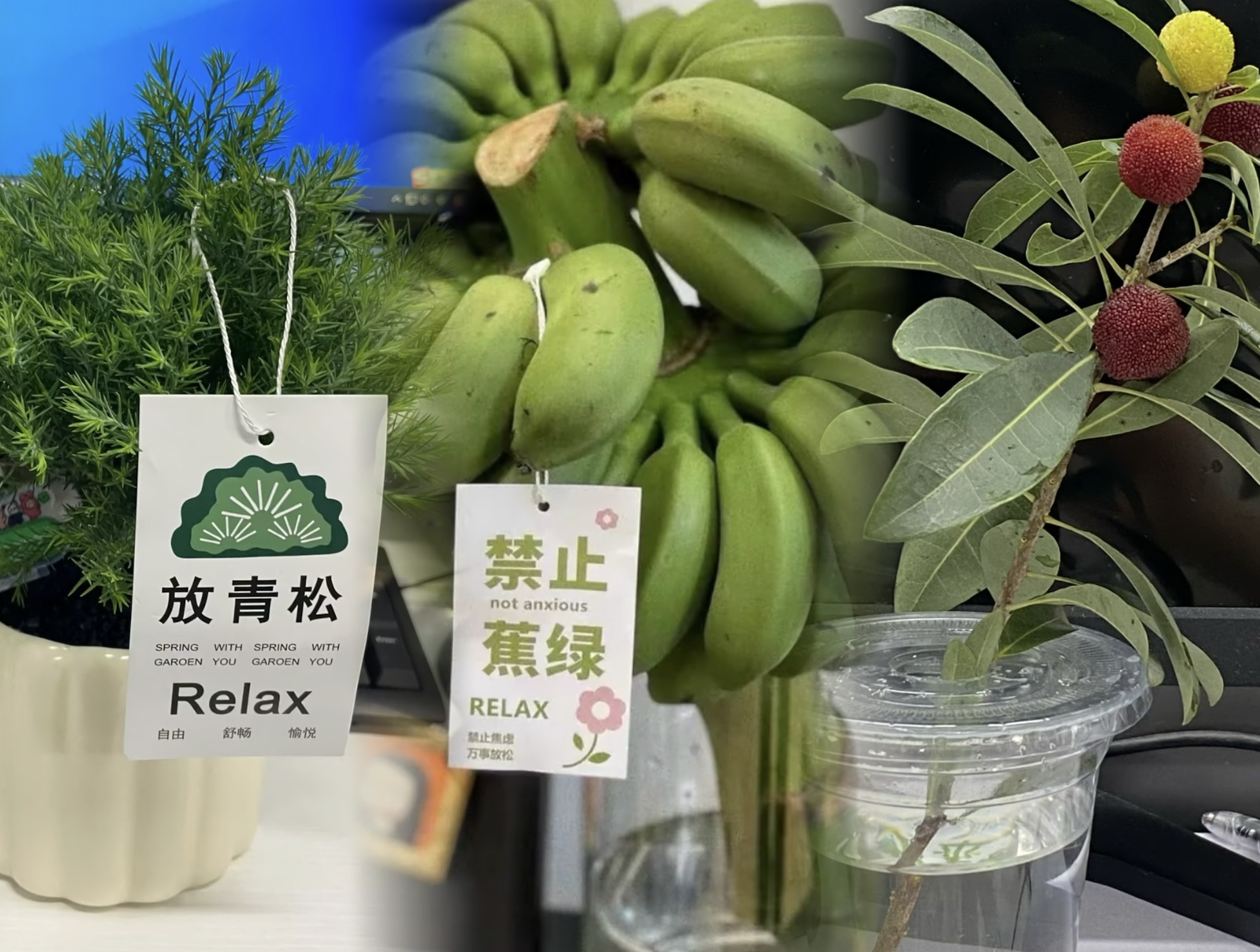 此外,年轻人不仅买花,还在“玩花”。社交平台上,#年宵花DIY#、#过年氛围拉满了##增添点年味儿#等话题热度攀升,不少人分享自己搭配年花、装饰花盆的心得。还有一批自带“梗感”的“情绪植物”也频频亮相年轻人的办公桌前:取名“放轻松”的北欧松枝、挂上 “禁止蕉绿”标签的青香蕉、松果与空气凤梨组合成的“黑凤梨”,还有可自由DIY的“杨梅”吐气......“好看、不贵、省心,拍照发朋友圈还能收获一堆点赞,感觉年的仪式感一下子就有了。”95后小陈表示。