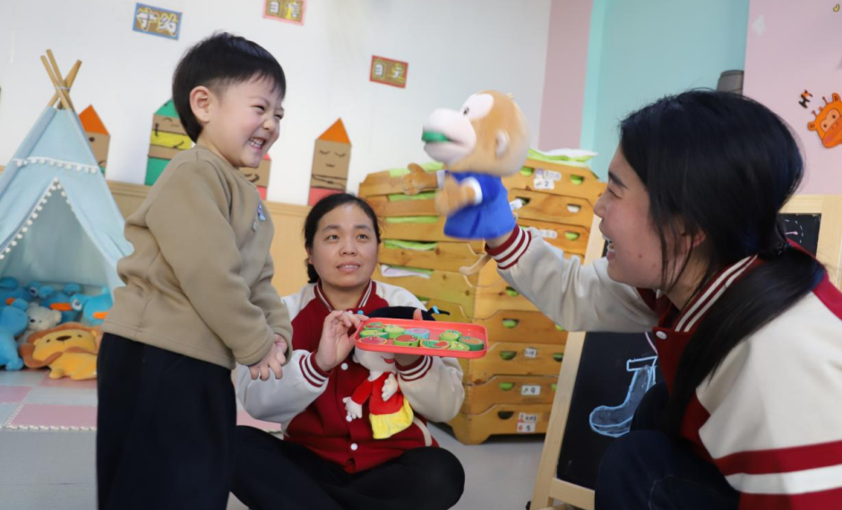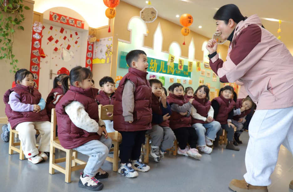 一头连着“夕阳红”的安心,一头系着“朝阳升”的欢笑。同日下午,郓城县鹏瑞托育中心内童声阵阵。一楼“儿童友好成长大剧场”里,老师正带领托一班20多名孩子做游戏。“我们通过手偶表演,让孩子们在轻松欢快的氛围中学会表达爱、分享爱。”中心负责人刘海英介绍。二楼托二班的低龄儿童,则在互动游戏中跟着老师认识各类水果。彩色玩具、温馨活动区,构成孩子们快乐成长的天地。“这里设施全,孩子吃得好、玩得开心,我们上班也踏实。”孩子已在此就读一年的家长吴文娟,对托育服务满是认可。