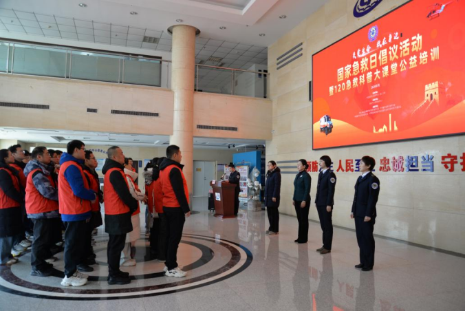 为响应“关爱生命,救在身边”为主题的国家急救日倡议活动暨120急救公益科普大讲堂公益培训,切实提升公众急救技能,促进“社会大急救”事业更好更快发展,1月20日上午,烟台市120急救指挥中心成功举办“120国家急救日倡议暨120急救科普大课堂公益培训”活动,同步开展“烟台市社会急救体系建设公益项目”推进活动和“生命护航”社会急救志愿服务启动活动。烟台市卫生健康委员会党组成员、三级调研员金玲同志出席活动并讲话,烟台市120急救指挥中心、烟台市红十字会相关负责同志以及来自全市卫生健康和红十字会系统的50余名社会急救志愿者代表参加活动。