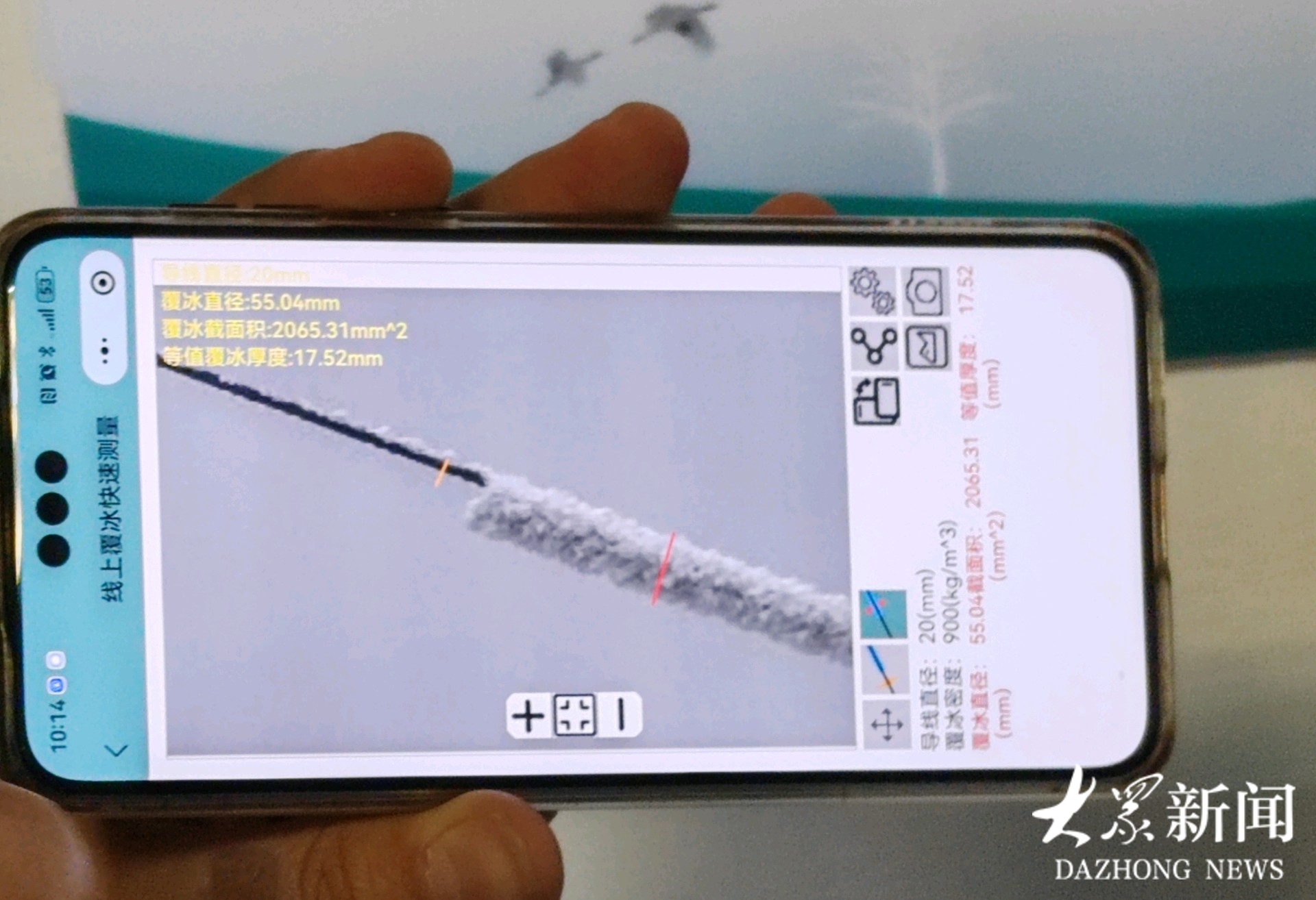 “16号接到气象预警当天我们就做好了人员、车辆、作业设备等准备,在恶劣气象开始前就进入到指定观冰点,之后每天都会将观测图像和数据分析情况传回。”王童璐点开手机小程序,向记者展示线上覆冰测量的结果,“将采集来的导线覆冰照片上传,输入相应导线数据,就能得到覆冰直径、厚度、截面积等情况。现在我们所在的观冰点气温已经降到了零下13℃,现场覆雪、覆冰情况较前两天明显减弱,线路无舞动。”