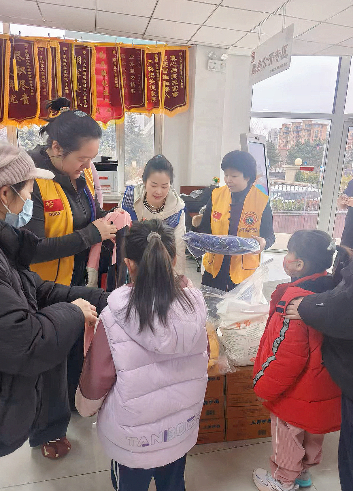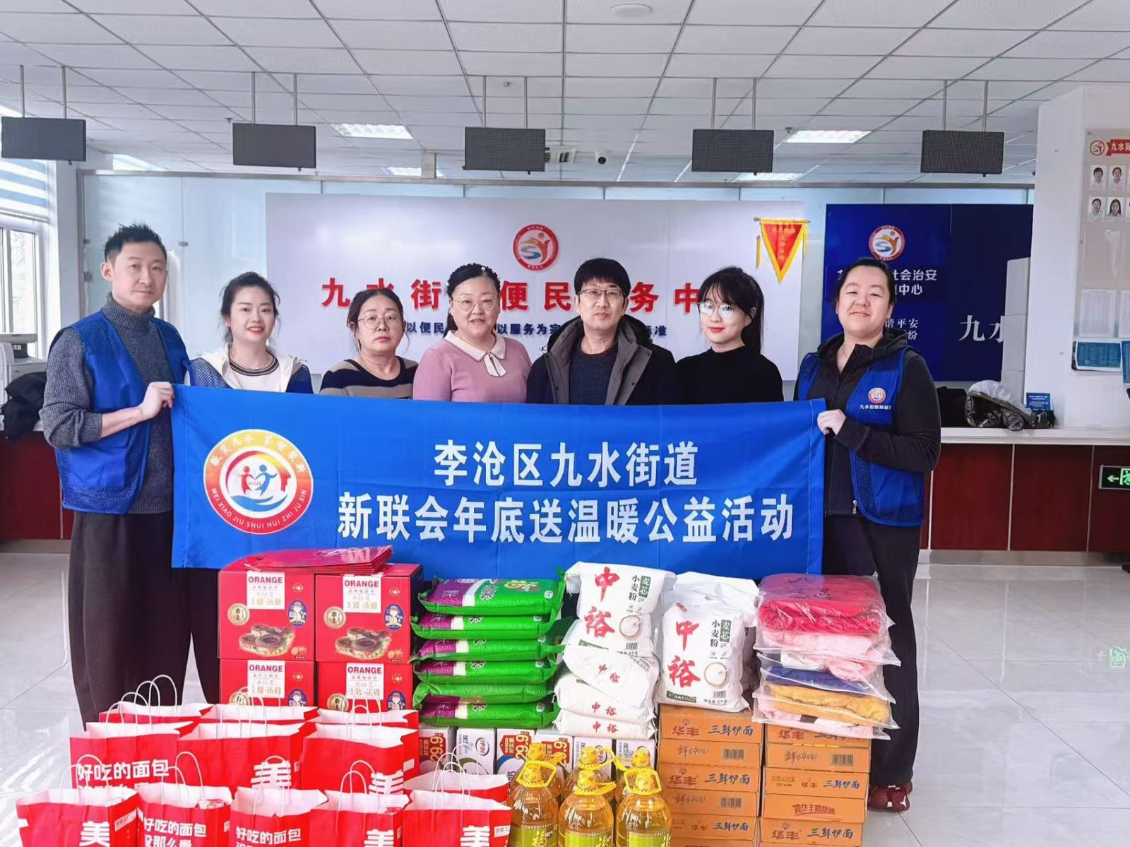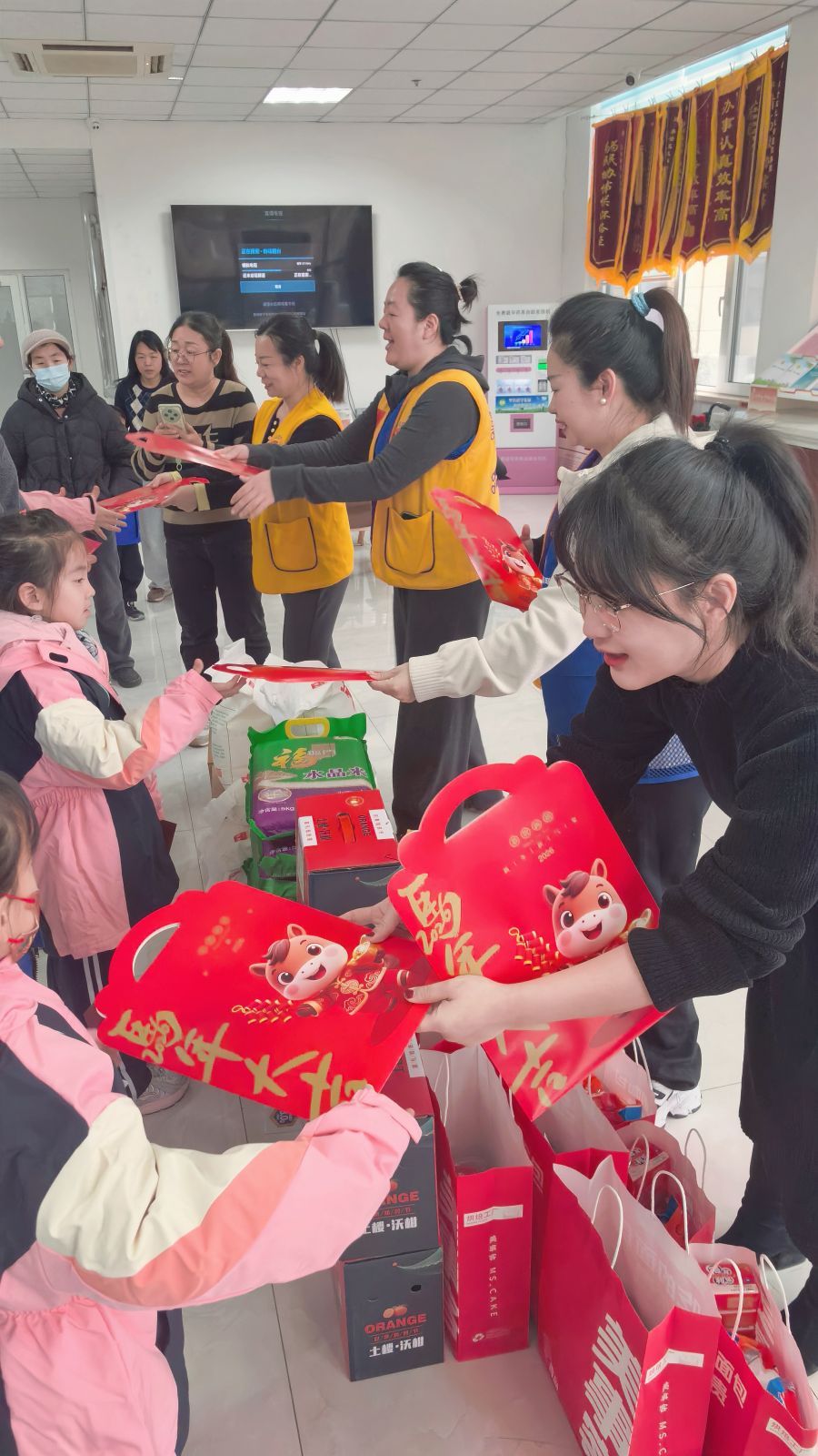 活动现场年味浓厚、暖意融融。街道便民服务中心内,袋装大米、优质面粉、新鲜时令水果、营养牛奶、实用洗化用品整齐码放,还有为孩子们量身挑选的羽绒服及新春红包,每份物资都精准贴合困难家庭日常所需与孩子成长需求。