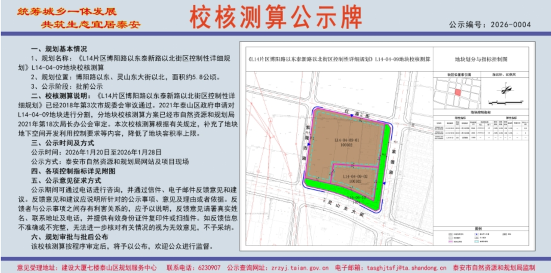 1月20日,泰安市自然资源和规划局网站发布2026-0004《L14片区博阳路以东泰新路以北街区控制性详细规划》L14-04-09地块校核测算,详情如下:
