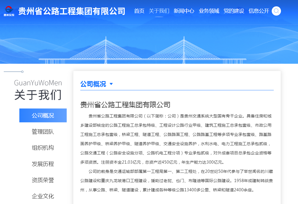 据贵州公路集团官网介绍,公司是贵州交通系统大型国有骨干企业,总资产近450亿元,年生产能力达300亿元。公司主要从事公路、桥梁、隧道建设等,累计建成各种等级公路13400多公里、桥梁和隧道2400余座。