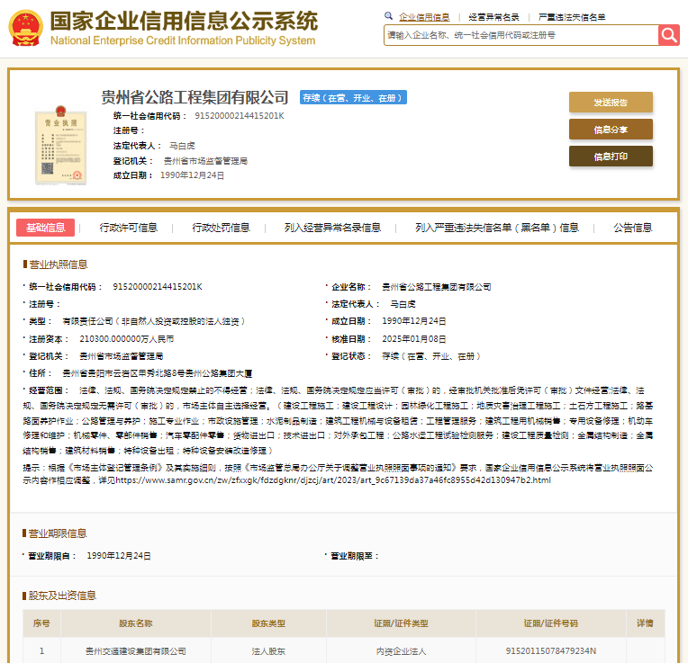 国家企业信用信息公示系统显示,贵州省公路工程集团有限公司成立于1990年,注册资本210300万元人民币,法定代表人马白虎,由贵州交通建设集团有限公司全资持股。