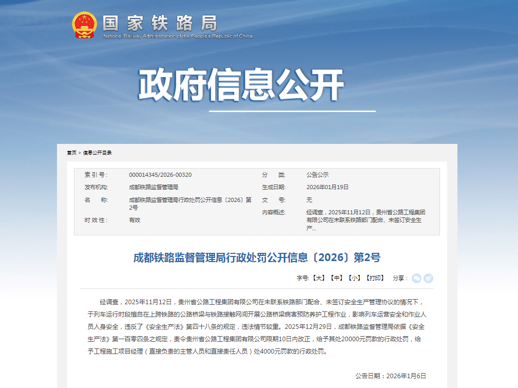 齐鲁晚报·齐鲁壹点记者于国家铁路局政府信息公开栏了解到,1月19日,其公示了成都铁路监督管理局行政处罚公开信息〔2026〕第2号。据悉,被行政处罚单位为贵州交通建设集团旗下的贵州省公路工程集团有限公司(下称“贵州公路集团”)。