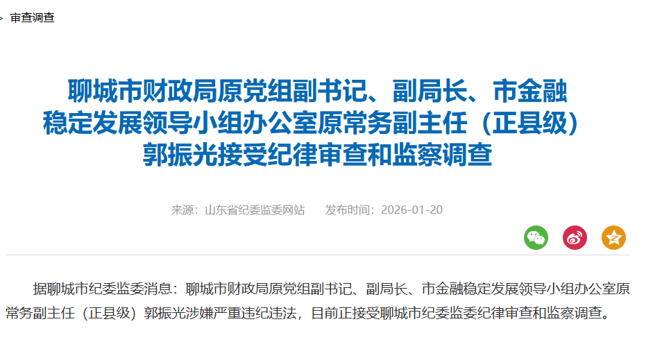 聊城市财政局原党组副书记、副局长、市金融稳定发展领导小组办公室原常务副主任(正县级)郭振光被查打虎拍蝇猎狐 | 2026-01-21 19:31:14 微信扫码扫码下载客户端据聊城市纪委监委消息:聊城市财政局原党组副书记、副局长、市金融稳定发展领导小组办公室原常务副主任(正县级)郭振光涉嫌严重违纪违法,目前正接受聊城市纪委监委纪律审查和监察调查。责任编辑:王相宜