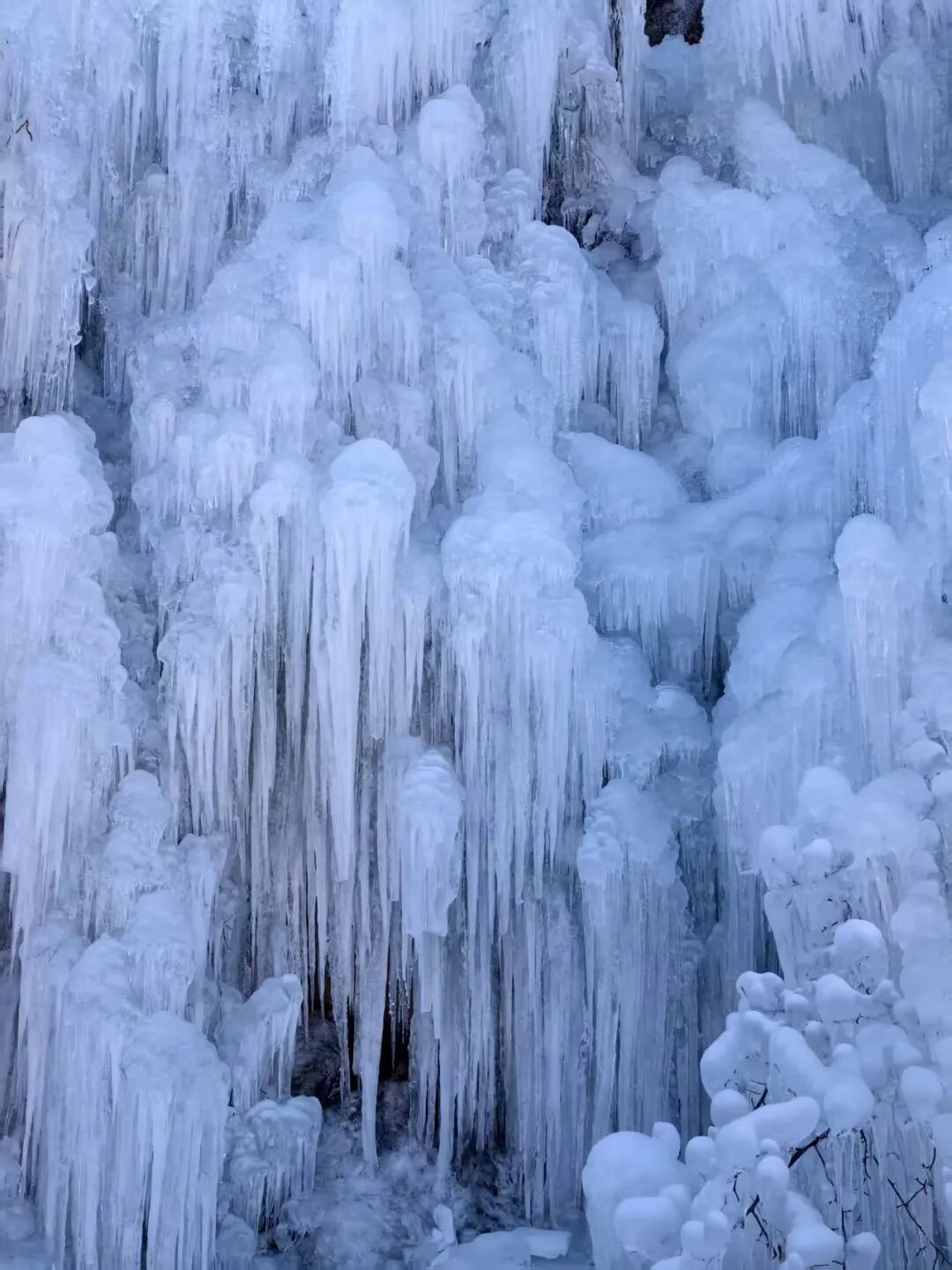 崖壁上垂落的冰柱、冰幔、冰帘