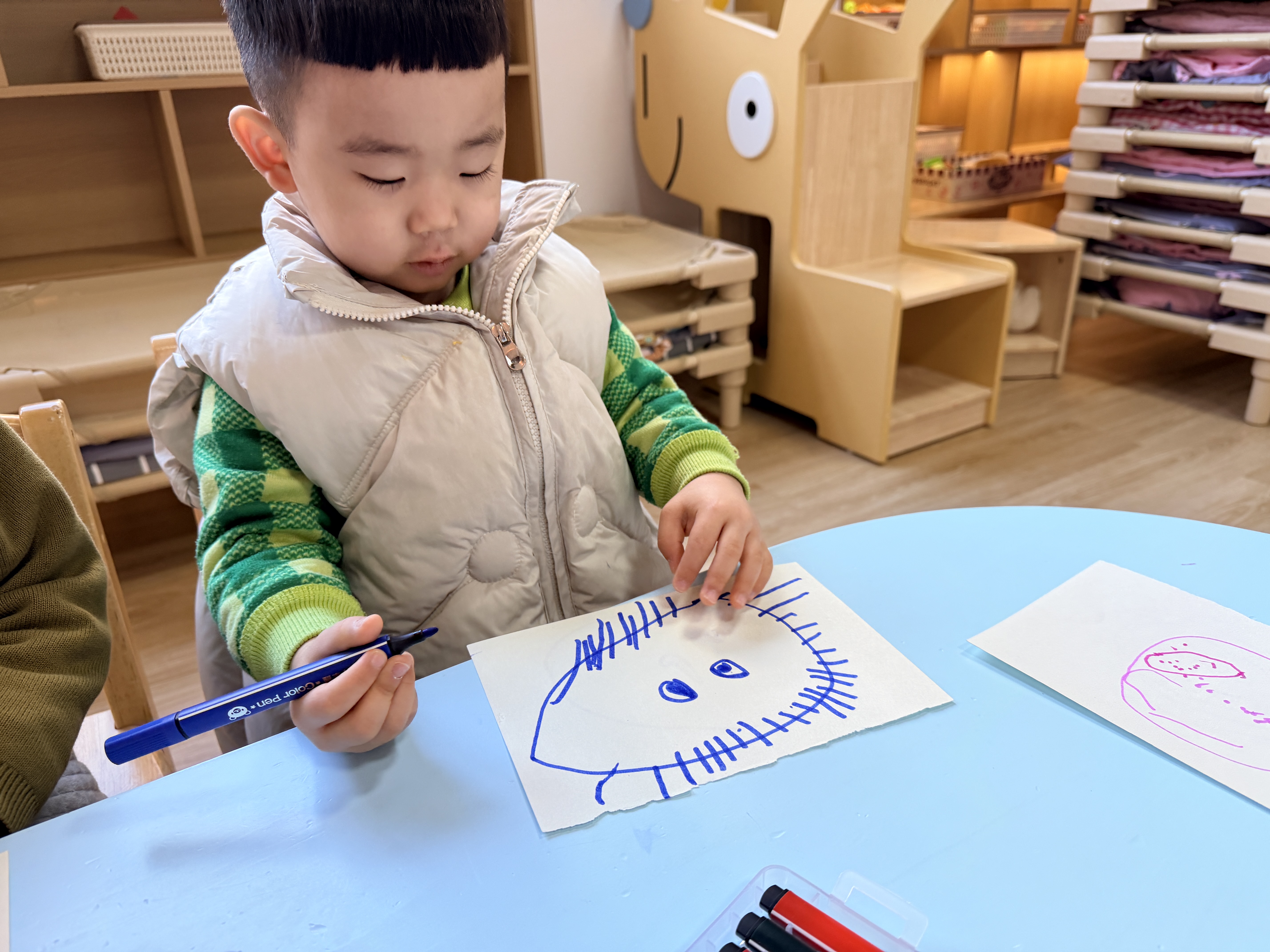 活动开始后,老师通过互动提问引发宝贝们的思考:“娃娃的眼睛是什么形状的”“我们的头发有黑色、棕色,还可以有什么颜色呀”“娃娃会笑,嘴巴是什么样子的呢?”一连串趣味问题点燃了宝贝们的创作热情,大家分享着自己的想法,教室里满是稚嫩的话语与欢快的笑声。