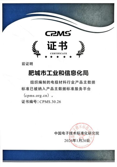 国家产品主数据标准(CPMS)是对国民经济各细分行业终端产品的属性、特征及信息进行统一描述的标准规范。从数据治理角度,CPMS是将产品信息数据规范化的数据字典;从应用层面,是保证各领域中跨企业、行业、不同系统间数据安全、可靠流转的标准;从更广层面,是物与物之间沟通信息交换的语义体系。CPMS通过给出统一的、用于产品信息描述的语义体系,解决传统工业品规格参数繁杂不统一、商品类别不全的问题,有效打通企业数据壁垒,加快提升产品信息规范性和统一性,为企业数字化转型规范并夯实数据底座,为实体经济高质量发展提供协同路径,为数据价值充分发挥提供基础支撑。此次获得的CPMS证书表明肥城市工信局组织编制的电极材料行业产品主数据标准已被正式纳入产品主数据标准服务平台,意味着本地产业数据将接入全国统一的数据交互体系,为新型电池电极材料产业集群的协同升级、数字化转型注入标准。