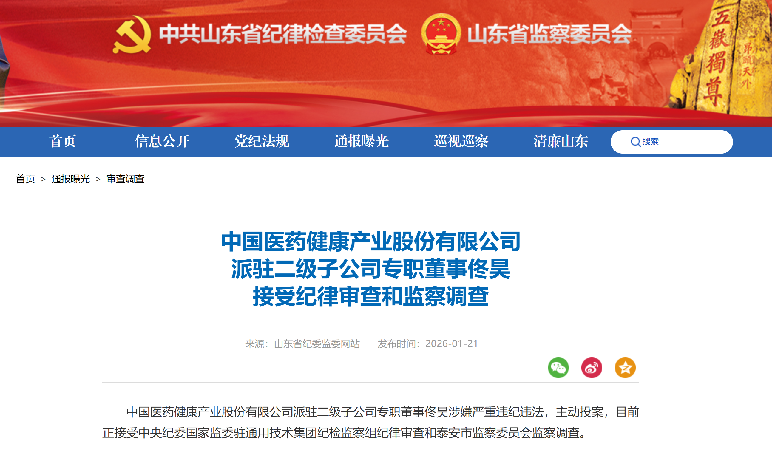 山东省纪委监委网站1月21日消息,中国医药健康产业股份有限公司派驻二级子公司专职董事佟昊涉嫌严重违纪违法,主动投案,目前正接受中央纪委国家监委驻通用技术集团纪检监察组纪律审查和泰安市监察委员会监察调查。
