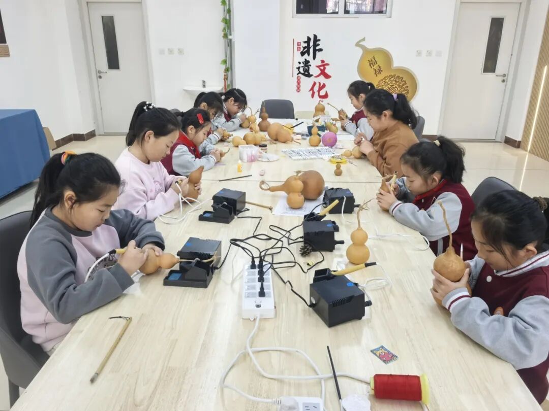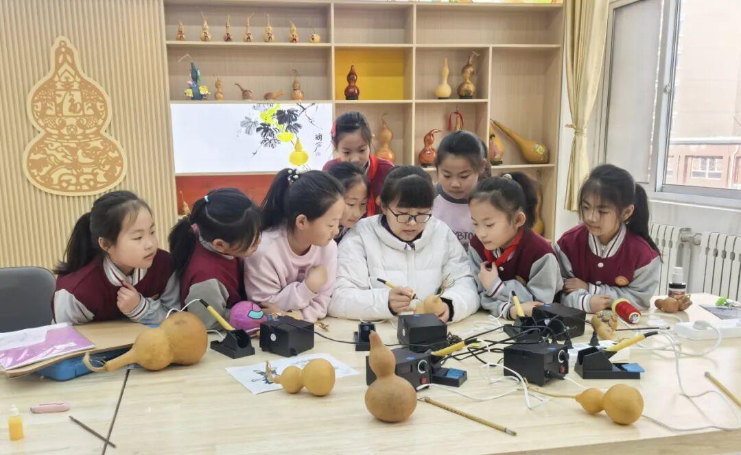 葫芦烙画作为国家级非物质文化遗产,被纳入“金色课堂”课程体系,让学生近距离感受传统工艺魅力。课程摒弃枯燥理论讲解,以趣味实践为主线,指导学生先熟悉烙画工具特性、掌握控温技巧,再循序渐进学习点、线、面烙烫手法,从简单纹样勾勒逐步进阶至完整作品创作。每一次烙铁与葫芦的精准触碰,都能让学生在动手实践中收获成就感,在创作中体悟非遗工艺的千年韵味,厚植文化自信。