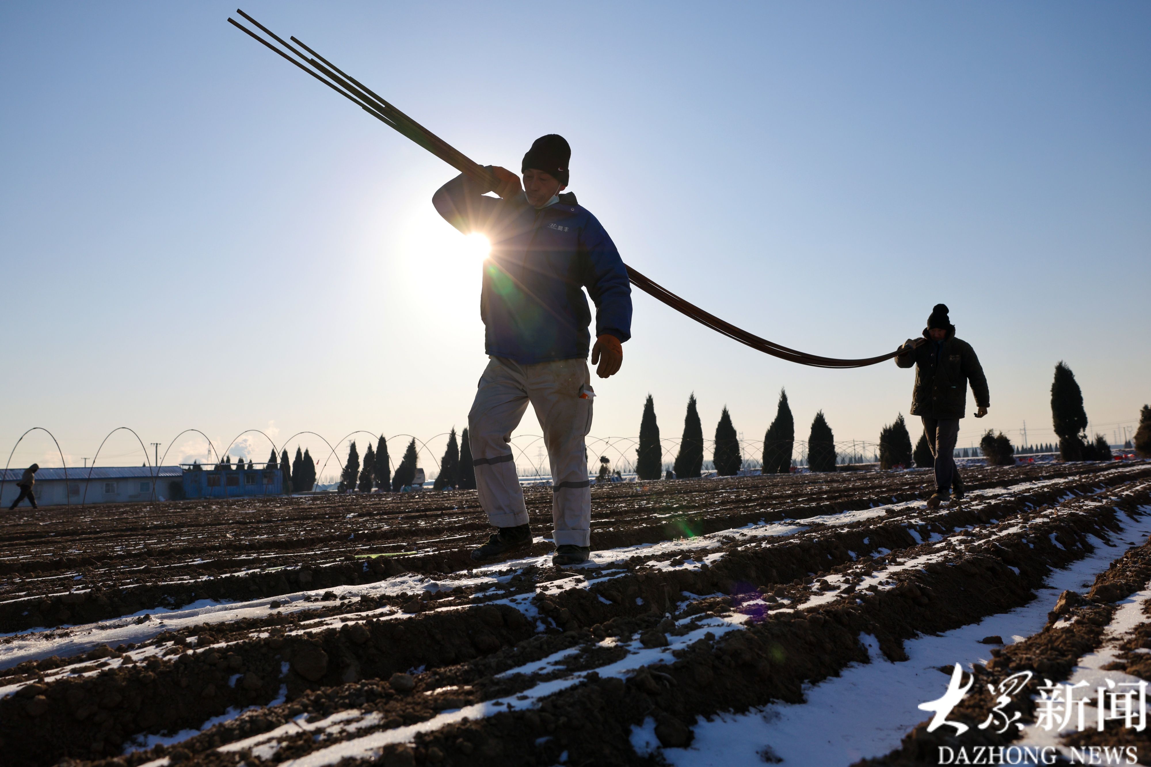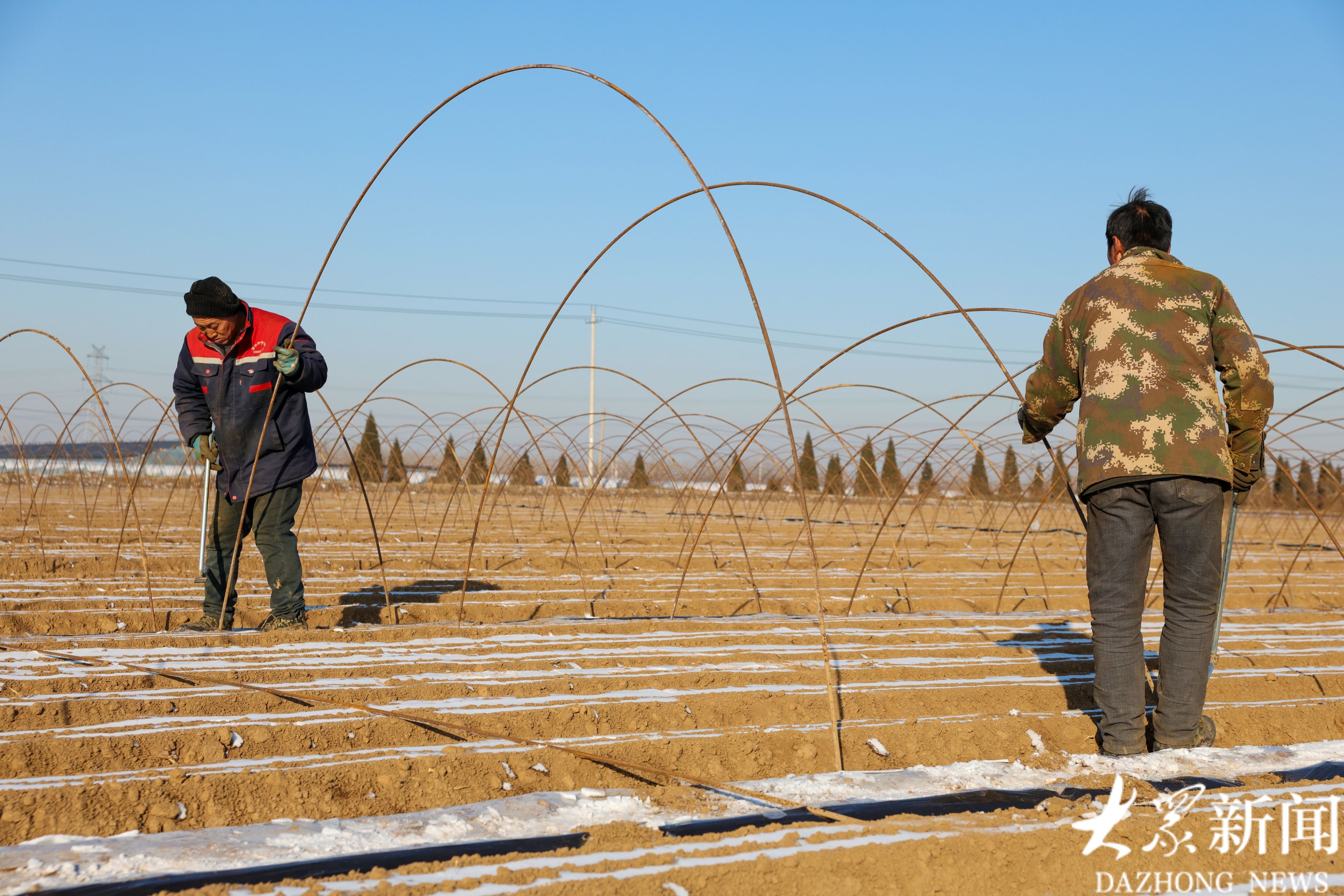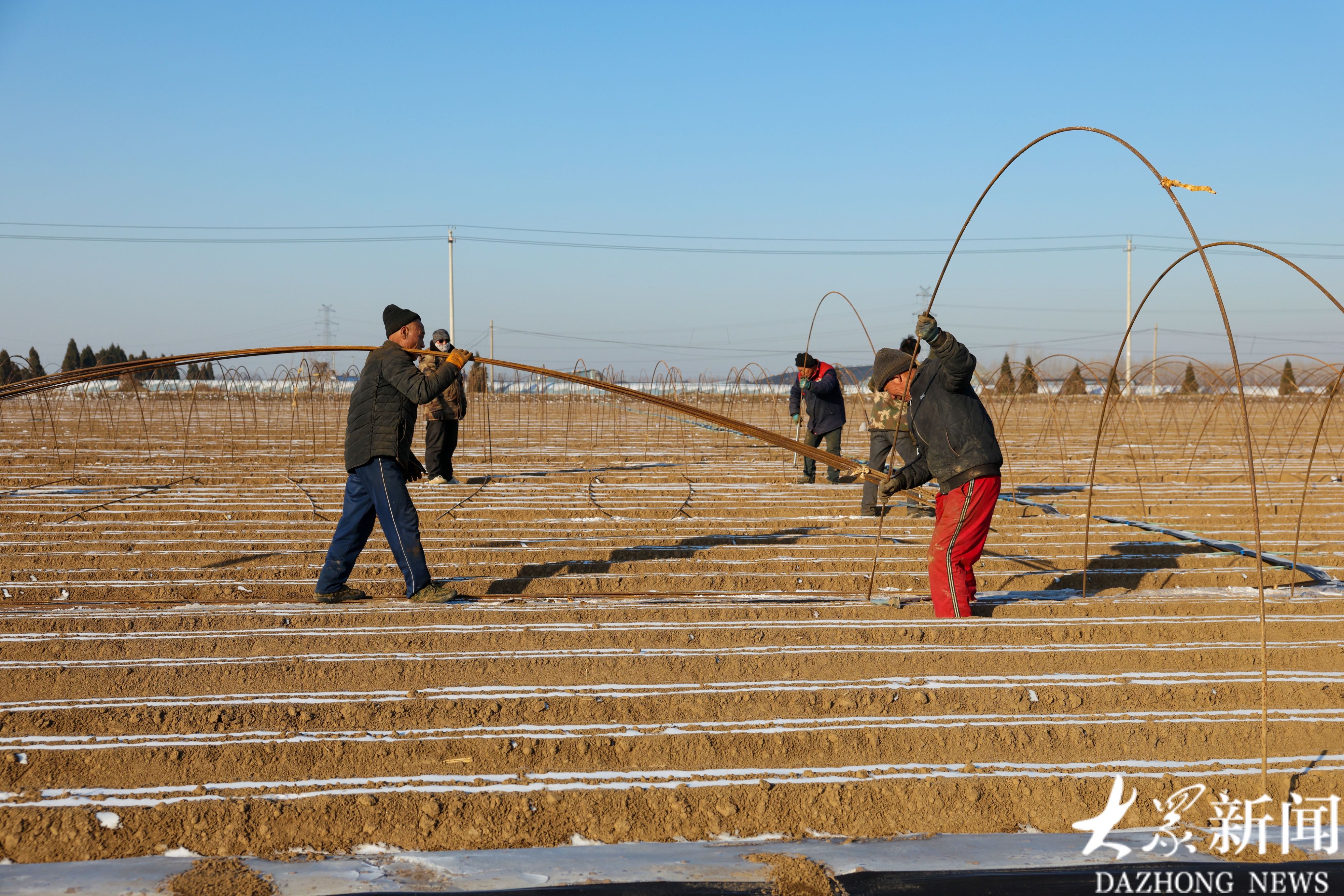 1月21日,广饶县大王镇一处胡萝卜种植基地内,工人们冒着严寒在田间插大棚支杆,加紧推进扣棚收尾工作。据了解,该基地2000余亩春季胡萝卜种植已接近尾声,所产胡萝卜将全部出口创汇。(大众新闻记者陆金星王琛)