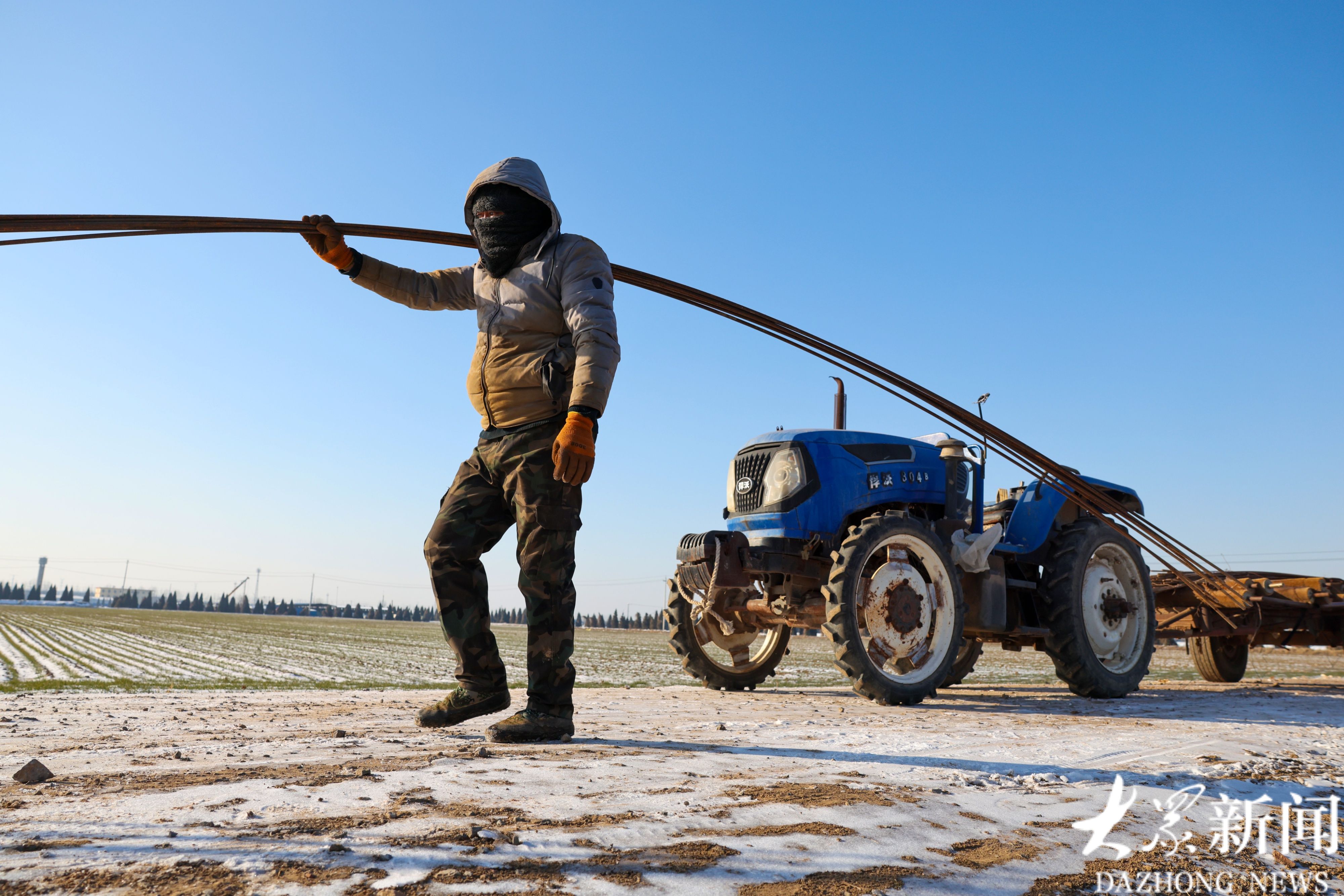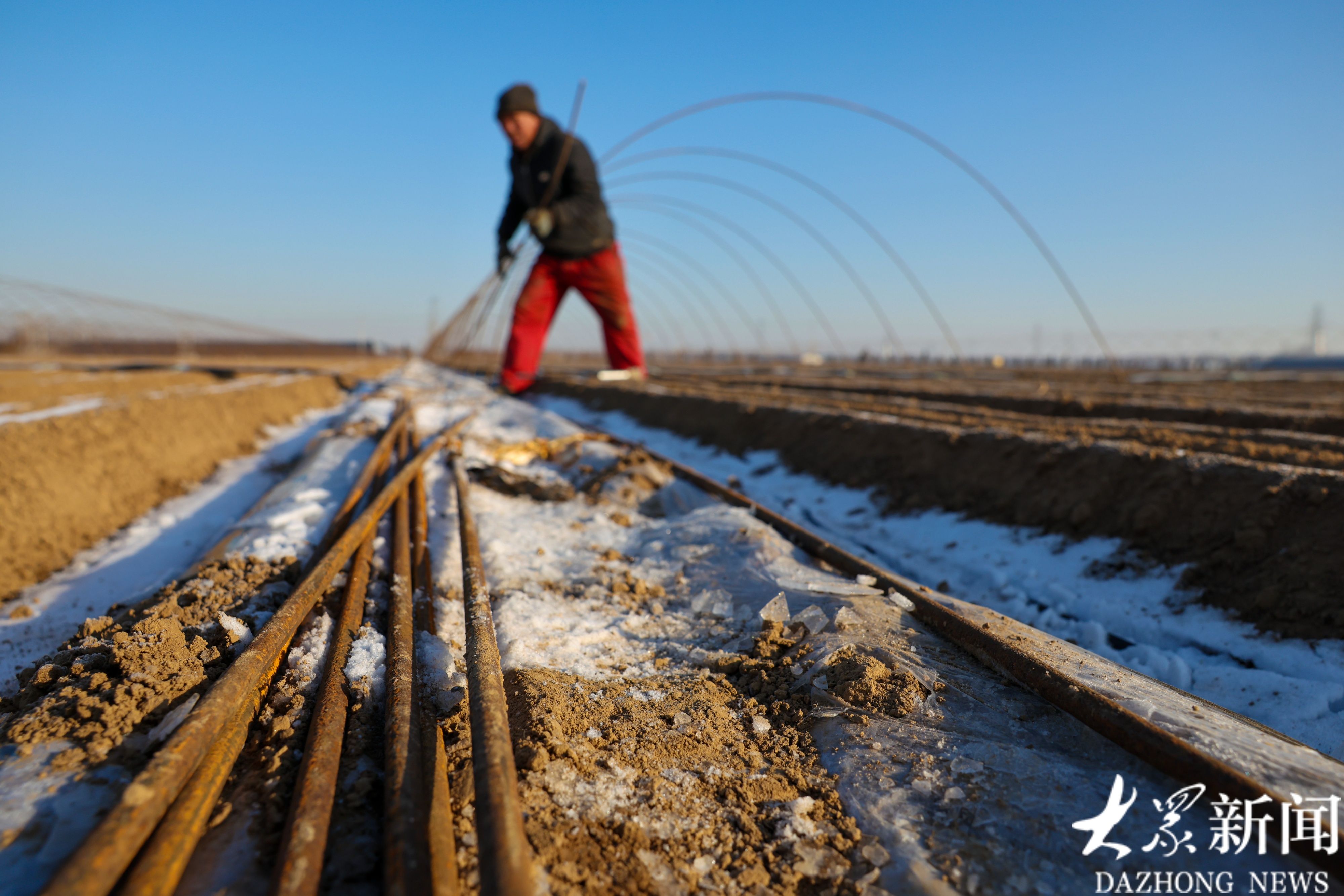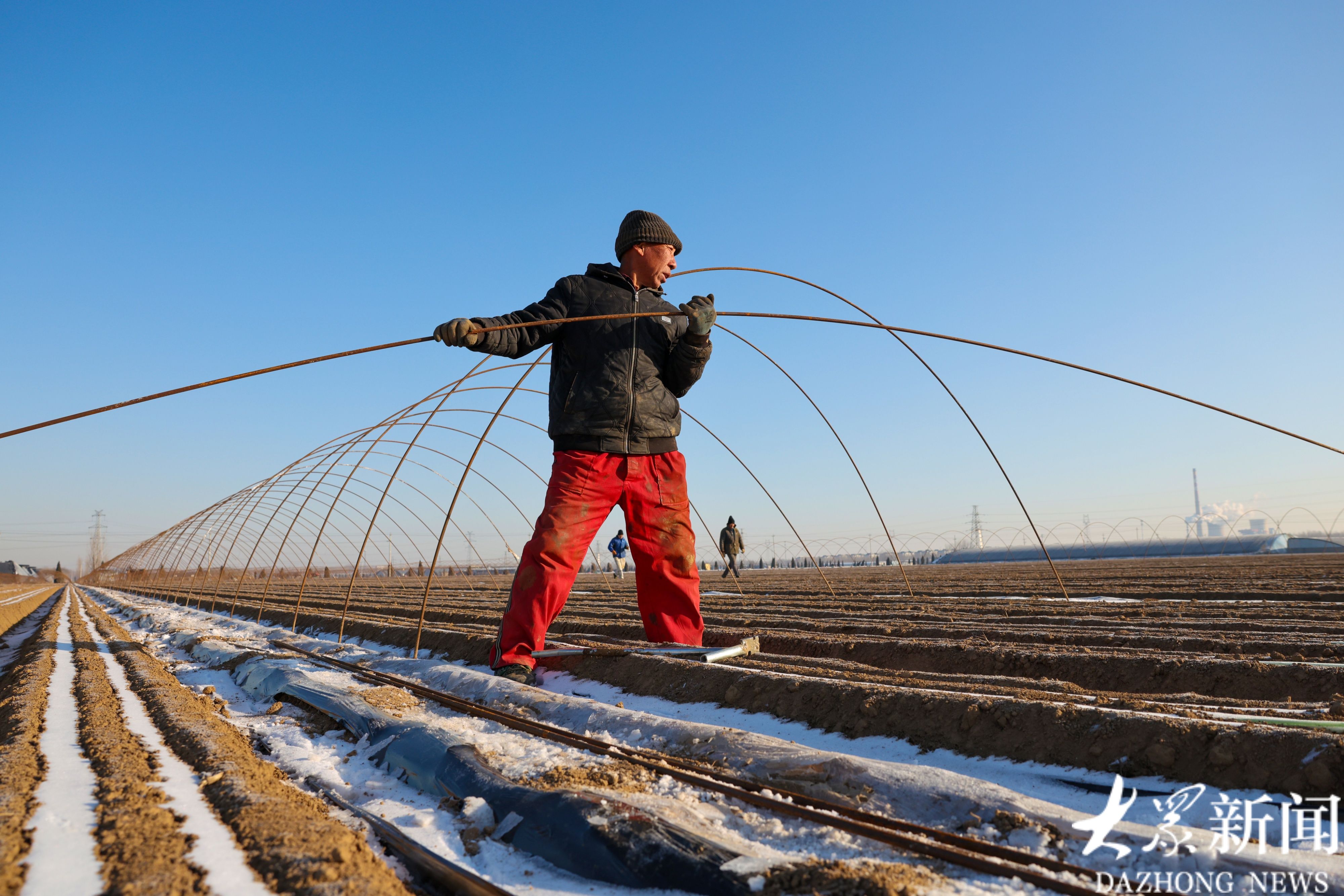 1月21日,广饶县大王镇一处胡萝卜种植基地内,工人们冒着严寒在田间插大棚支杆,加紧推进扣棚收尾工作。据了解,该基地2000余亩春季胡萝卜种植已接近尾声,所产胡萝卜将全部出口创汇。(大众新闻记者陆金星王琛)