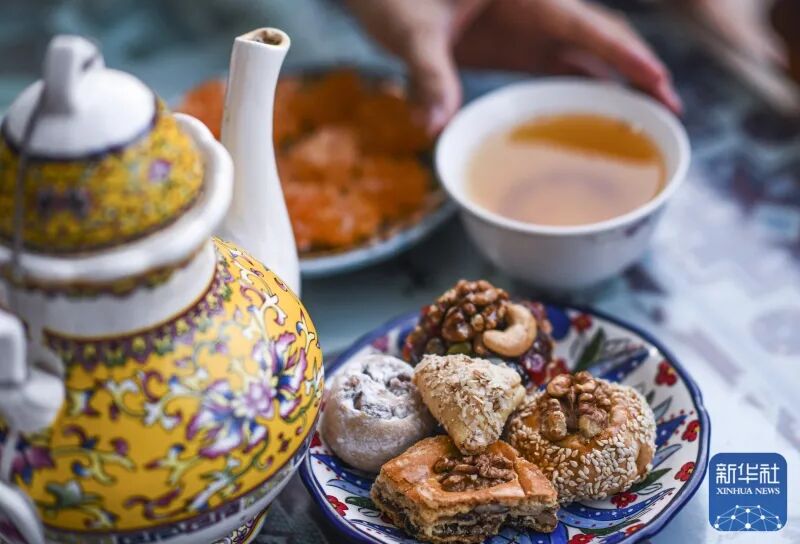 在喀什古城百年老茶馆内,茶客在品尝特色茶饮和茶点。来源:新华社