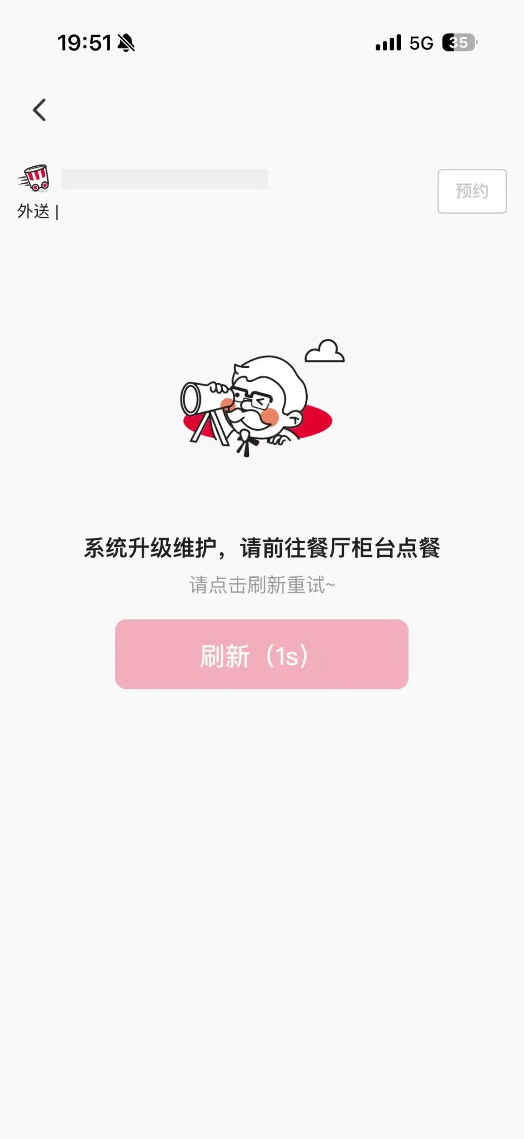 据了解,今天是肯德基疯狂星期四活动日,半价外送,不少网友网购肯德基。据媒体报道,有记者19点50左右进入肯德基App,点击外送到家,出现以下图片,仍显示系统升级维护中。