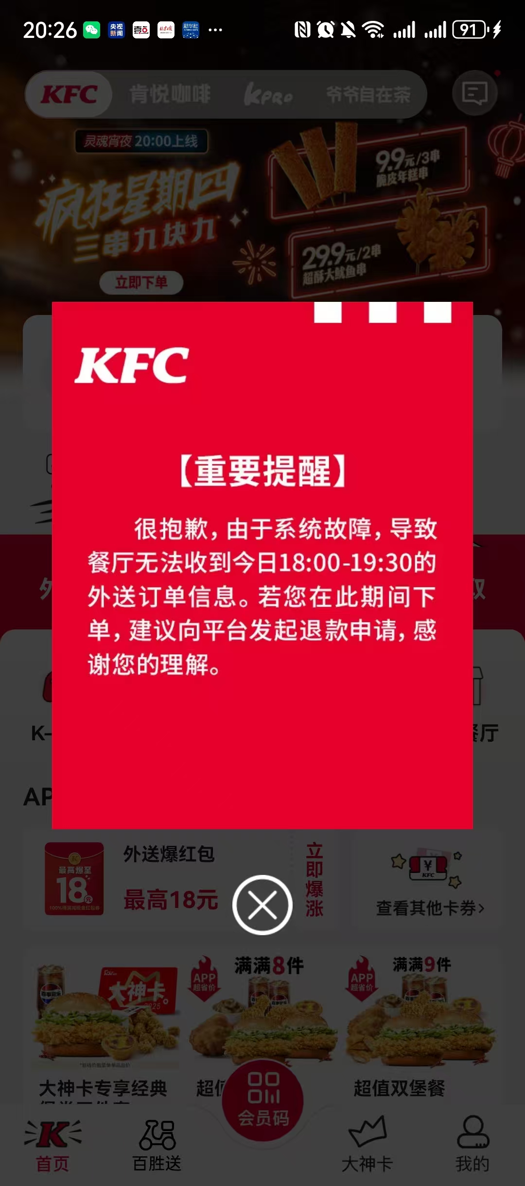 晚8点20分左右,记者进入肯德基App,然后弹出一则重要提醒:很抱歉,由于系统故障,导致餐厅无法收到今日18:00-19:30的外送订单信息。若您在此期间下单,建议向平台发起退款申请,感谢您的理解。