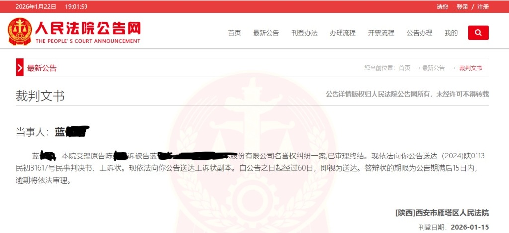 一审时,被告蓝某某未到庭应诉,亦未提交书面答辩意见。一审判决后,由于无法联系到蓝某某,故法院于日前以公告送达形式向其送达一审判决书等。1月22日,陈某某表示,其认可一审判决结果,但因被告公司已提起上诉,故该判决尚未生效。