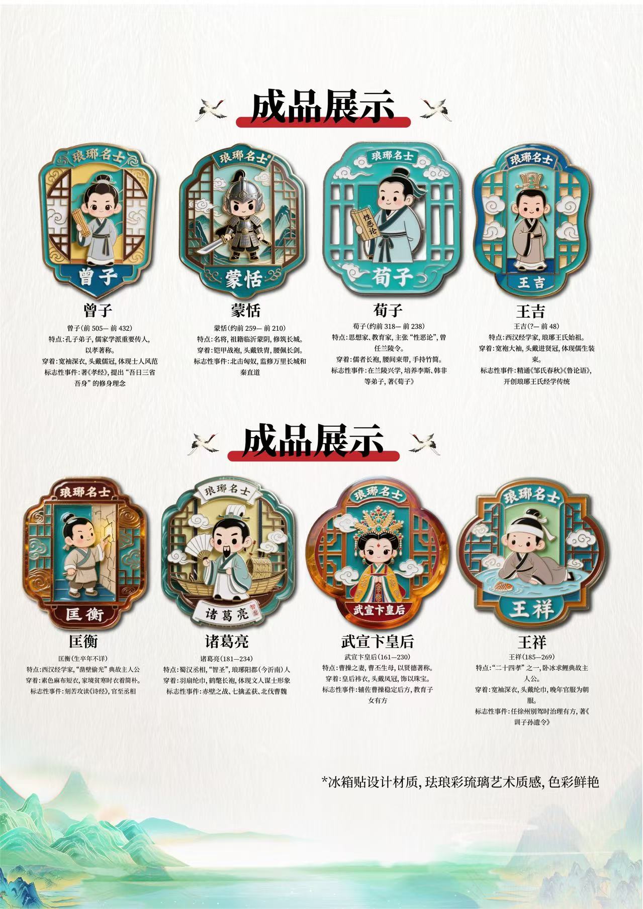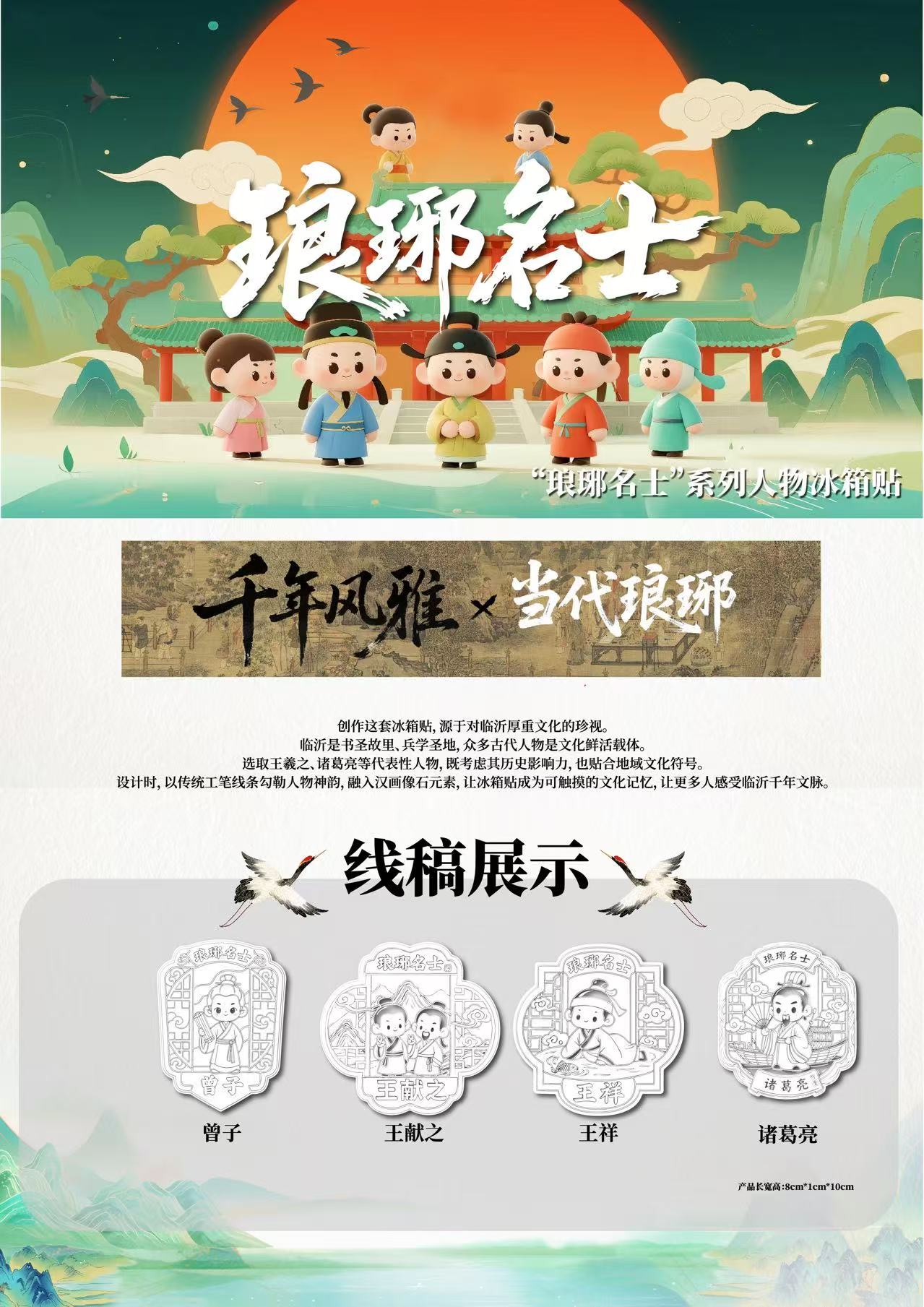 刘一锟老师的参赛作品《琅琊名士-人物冰箱贴系列》,深度挖掘临沂琅琊文化核心内涵,将历史名士形象与现代设计美学相融合,既彰显了鲜明的地域文化特色,又兼具实用价值与市场推广潜力。该作品的创作灵感源于学校商贸系“对接区域产业、服务地方发展”的专业建设导向,更是教师将沂蒙精神中“开拓奋进”的内核融入教学实践、探索“文化+商贸+设计”融合创新的生动体现。作品在众多参赛作品中崭露头角斩获殊荣,不仅是对教师个人专业能力的高度认可,更印证了学校商贸类专业教学改革的丰硕成果。