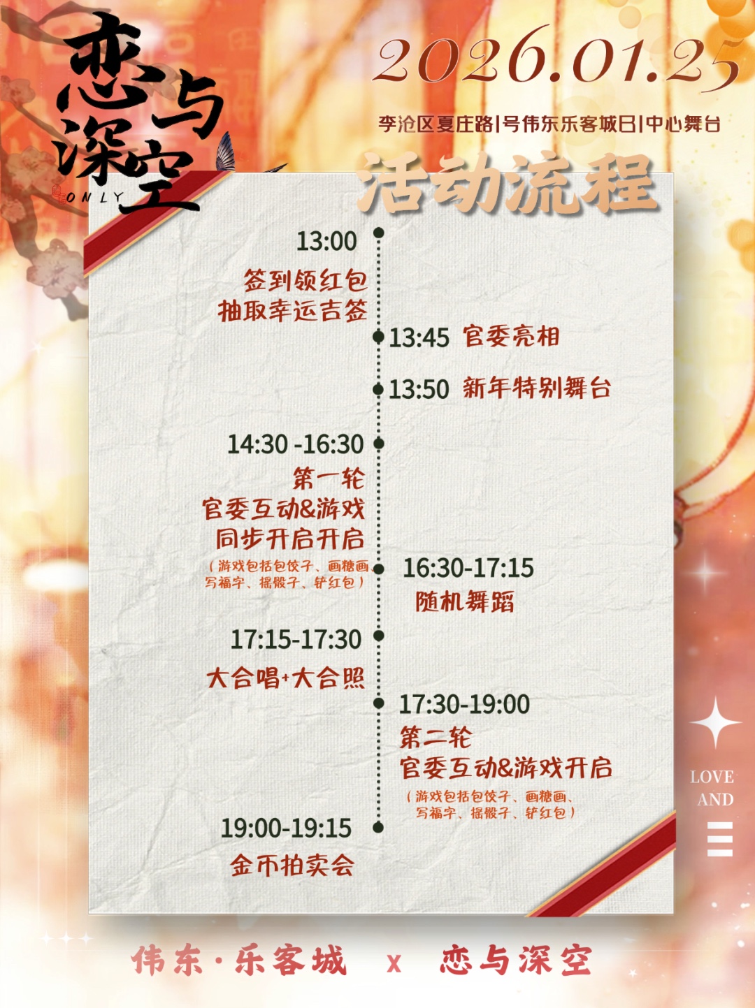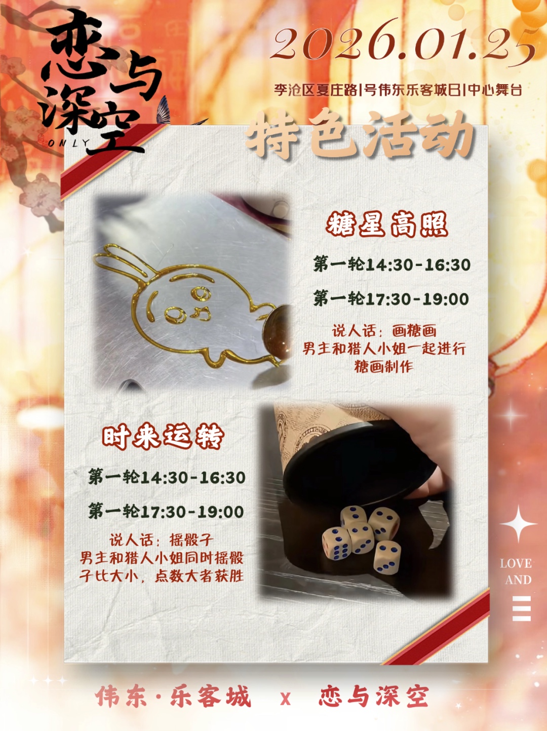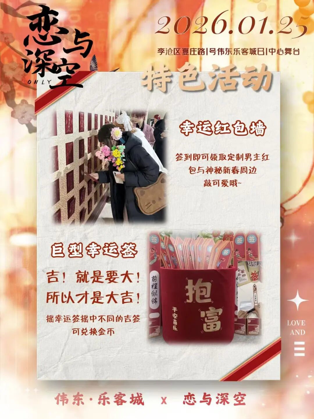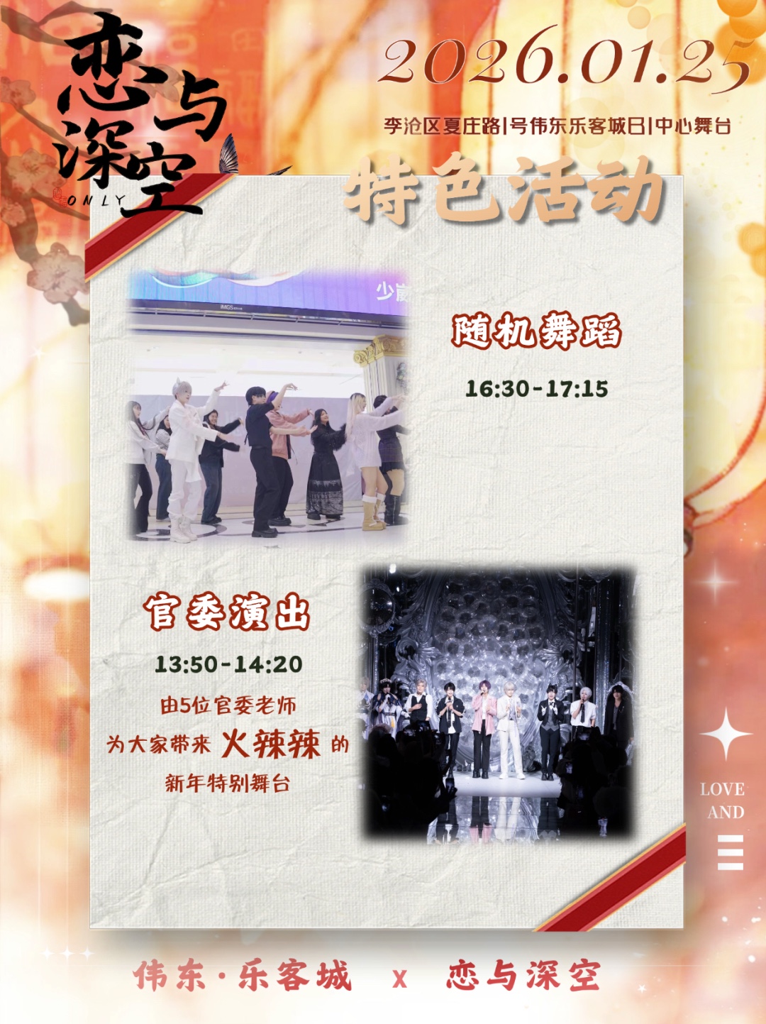 本周日(1月25日),乐客城还将带来“恋与深空 暖冬同岁”活动,趣味游戏、官微互动、随机舞蹈等精彩环节,让你快乐一整天!