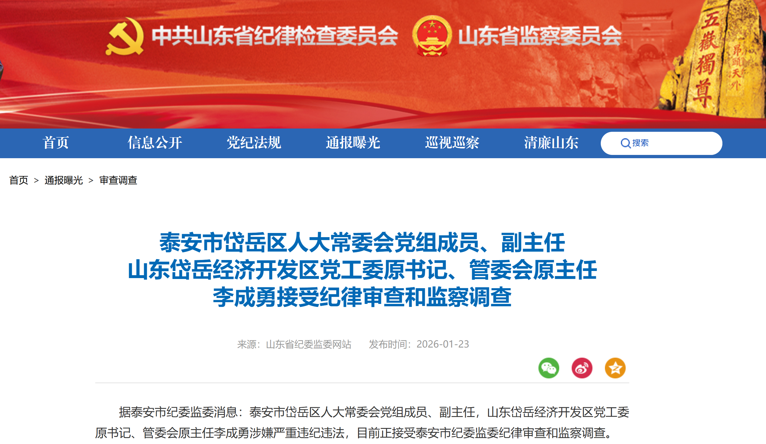 泰安市岱岳区人大常委会党组成员、副主任李成勇接受审查调查观政 | 2026-01-24 14:05:07 原创范佳 范佳来源:齐鲁晚报·齐鲁壹点客户端微信扫码扫码下载客户端山东省纪委监委网站1月23日消息,泰安市岱岳区人大常委会党组成员、副主任,山东岱岳经济开发区党工委原书记、管委会原主任李成勇涉嫌严重违纪违法,目前正接受泰安市纪委监委纪律审查和监察调查。责任编辑:范佳