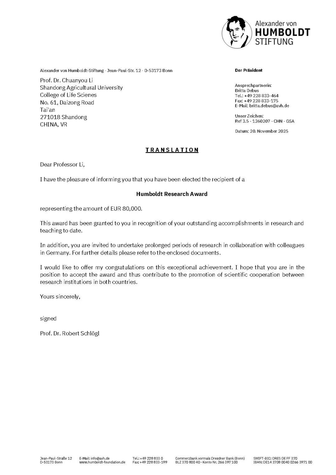 该成果2024年发表于《细胞》,中国科学院院士许智宏、种康和奥地利科学院院士Jiří Friml等对该研究给予高度评价。成果第一完成人李传友获洪堡研究奖。