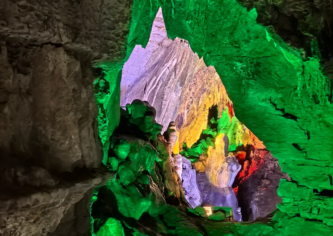 洞内设置六大主题厅,水帘洞厅入口处石壁小洞如水帘垂落,宋代石刻“李”“女”“遇”字迹依稀可辨;龙脊厅45米长的“龙脊”构造罕见壮观,如巨龙盘踞。