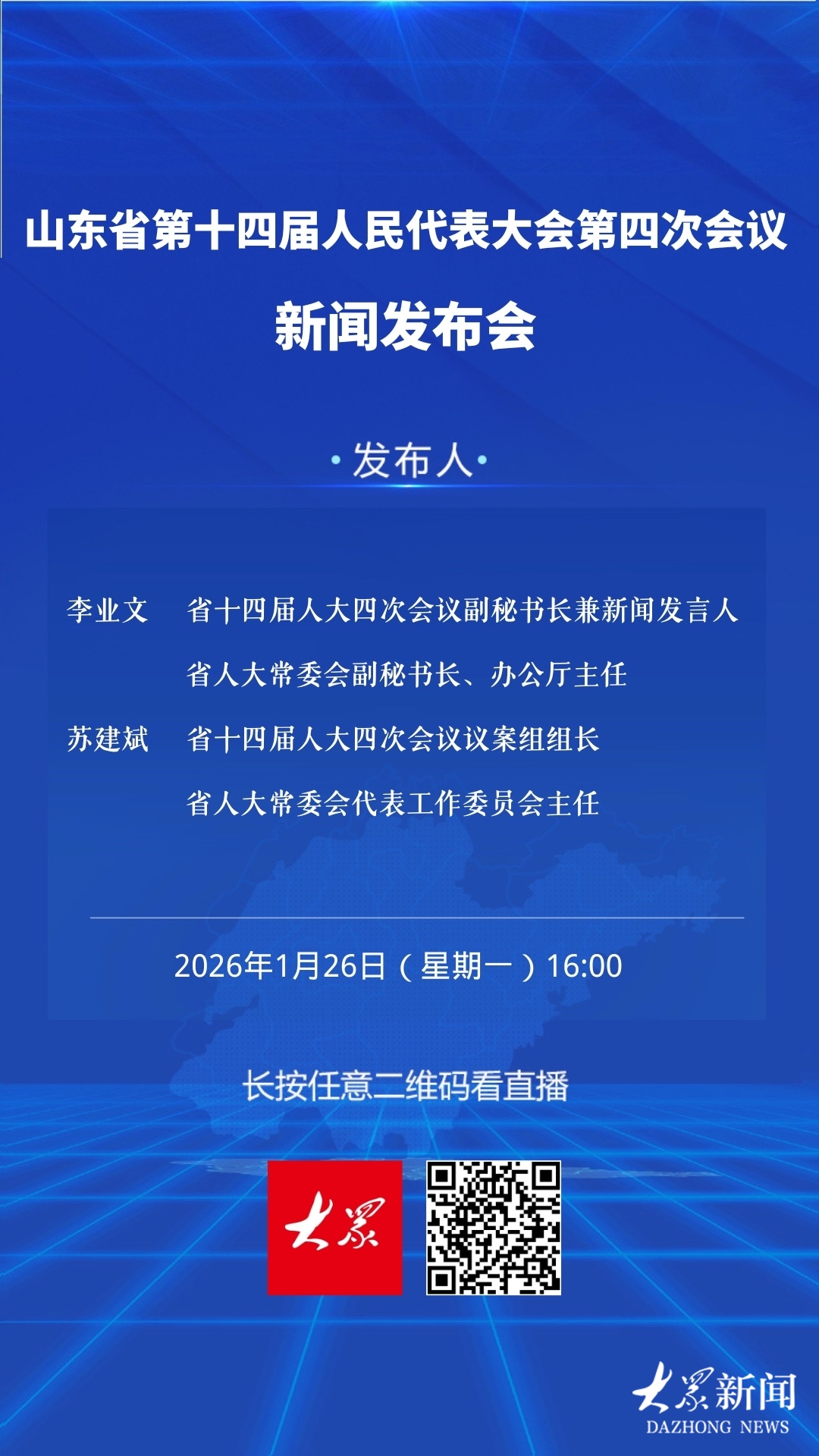 省十四届人大四次会议新闻发布会定于2026年1月26日(星期一)下午4:00举行。省十四届人大四次会议副秘书长、省人大常委会副秘书长、办公厅主任李业文等介绍大会会议议程及有关安排。(大众新闻记者崔晗高广超)
