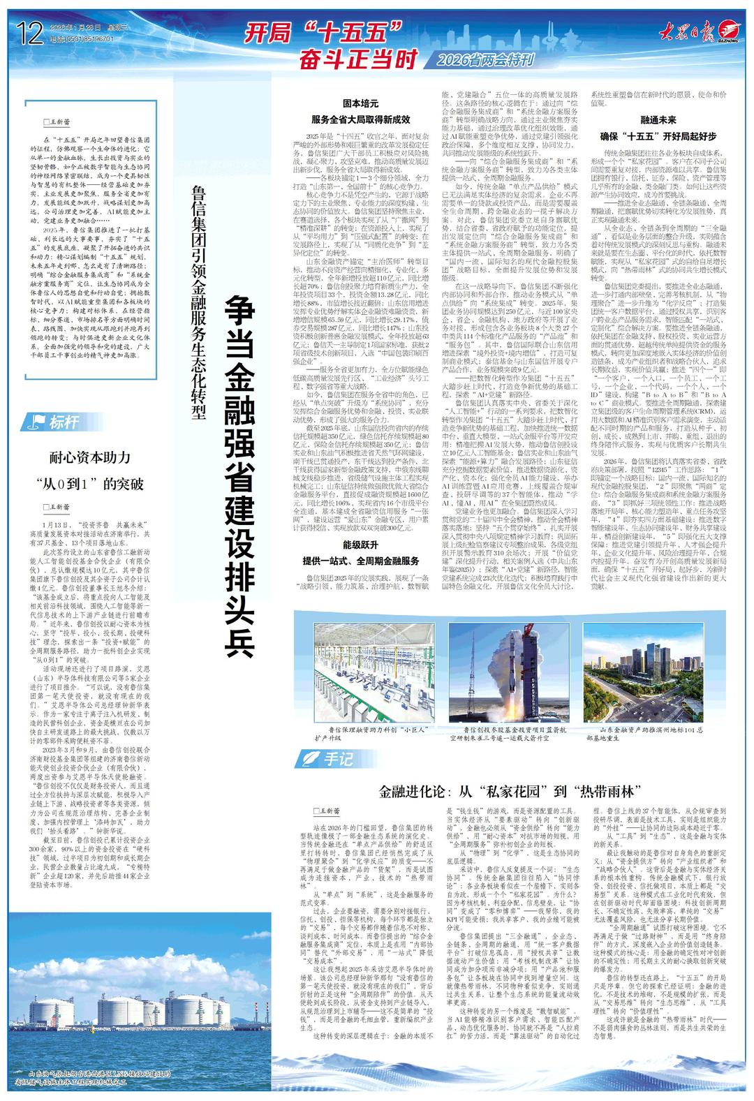 2025年,鲁信集团推进了一批打基础、利长远的大事要事,夯实了“十五五”的发展底座,凝聚了开拓奋进的共识和动力:精心谋划编制“十五五”规划,未来五年走到哪、怎么走有了清晰路径;明确“综合金融服务集成商”和“系统金融方案服务商”定位,让生态协同成为全体鲁信人的思想自觉和行动自觉;拥抱数智时代,以AI赋能重塑集团和各板块的核心竞争力;构建对标体系,在经营指标、细分赛道、市场排名等方面明确时间表、路线图,加快实现从跟跑到并跑再到领跑的转变;与时俱进更新企业文化体系,全面加强党的领导和党的建设,广大干部员工干事创业的精气神更加高涨。