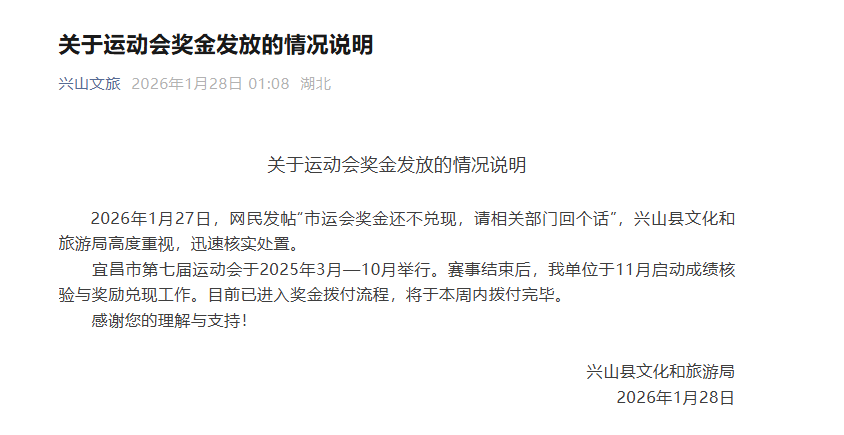 市运会奖金不兑现,多名运动员发帖追讨,湖北兴山文旅凌晨通报