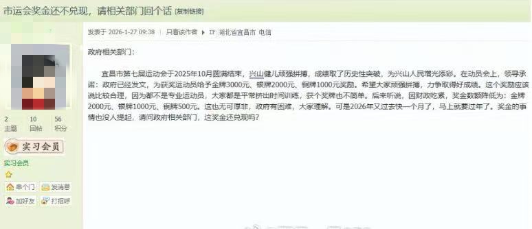 “讨要奖金”的帖子最初发布在兴山县当地论坛,后被搬运到社交平台引起关注。帖文称,宜昌市第七届运动会于2025年10月圆满结束,兴山健儿取得了历史性突破成绩。当地相关部门曾承诺,为获奖运动员给予金牌3000元、银牌2000元、铜牌1000元奖励,希望大家顽强拼搏,力争取得好成绩。