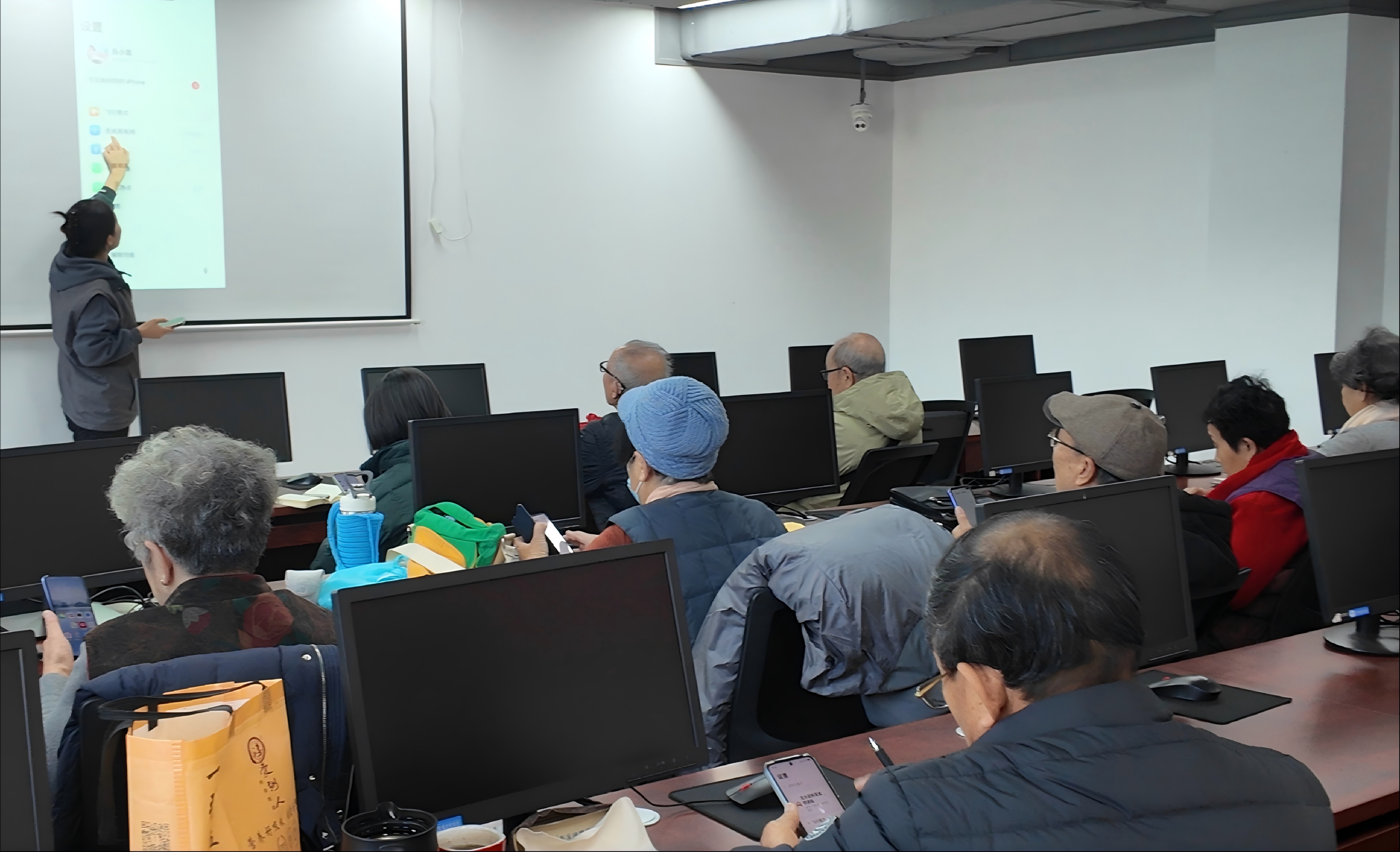 这堂课的主题是微信应用。工作人员将手机界面投屏,逐步讲解如何添加删除联系人、发送照片视频、共享实时位置、群发消息等功能。两名志愿者在台下穿梭,手把手地辅导。