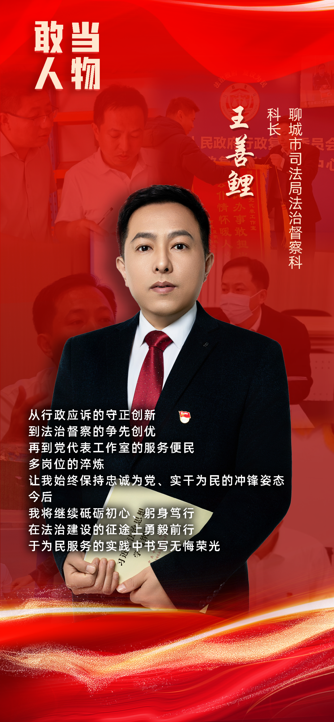王善鲤,现任聊城市司法局法治督察科科长,先后获评“全国行政复议行政应诉先进个人”“山东省改革尖兵”等荣誉称号。