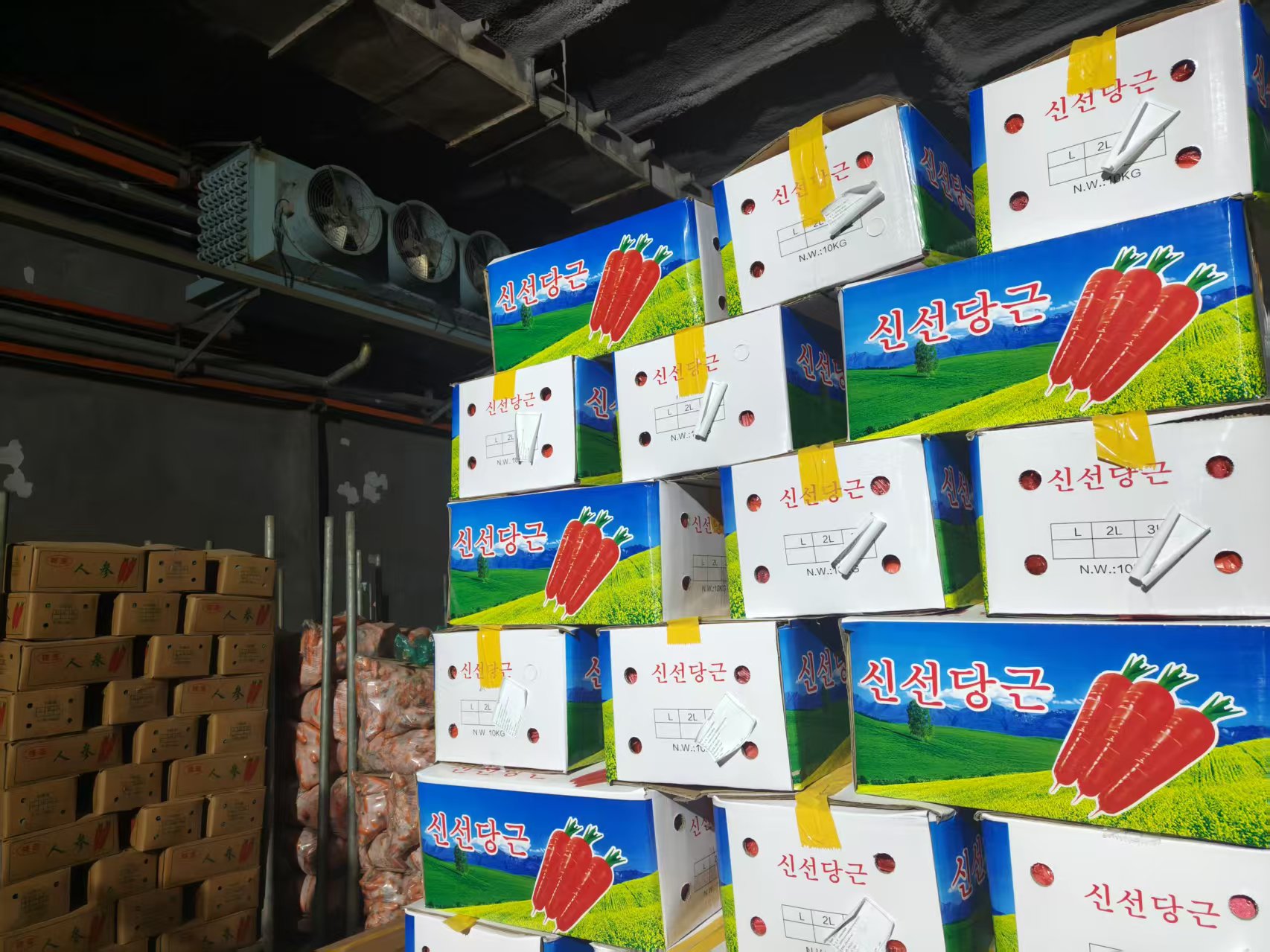 辛爱忠的冷库里,堆放着印有“新鲜胡萝卜”韩文、日文字样的包装箱。都亚男摄