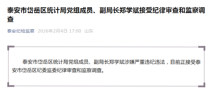 泰安市岱岳区统计局党组成员、副局长郑学斌涉嫌严重违纪违法,目前正接受泰安市岱岳区纪委监委纪律审查和监察调查。