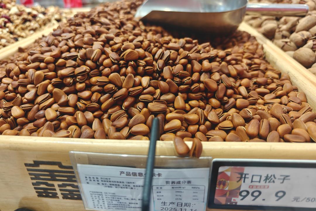 随后,记者走进北西五路中段的鑫忆品香干果店,这里主打现炒现卖,干果新鲜度十足。同款干果价格与薛记炒货呈现明显差异:开口松子售价99.9元/斤,比薛记炒货高出16.1元/斤;巴西松子158.8元/斤,较薛记198元/斤的手剥松子便宜近40元;此外,散装每日坚果(核桃仁)56.8元/斤、中尖碧根果59.8元/斤,价格均低于薛记同类产品。