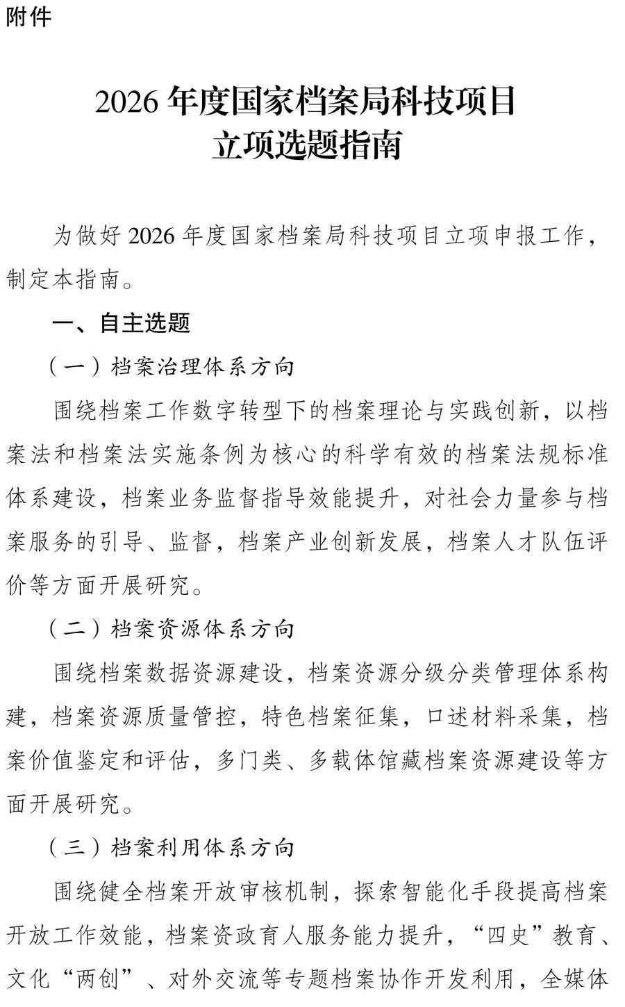 2026年2月3日,国家档案局印发《2026年度国家档案局科技项目立项选题指南》(以下简称《指南》),项目涵盖5大自主选题方向和8大重点项目。其中,在重点项目中,专门设立了“档案高质量数据集建设”、“重大工程建设项目档案数据治理”、“企业档案数据要素化开发利用”、“人工智能应用安全评估”、“档案数据服务国家战略”等前沿方向。