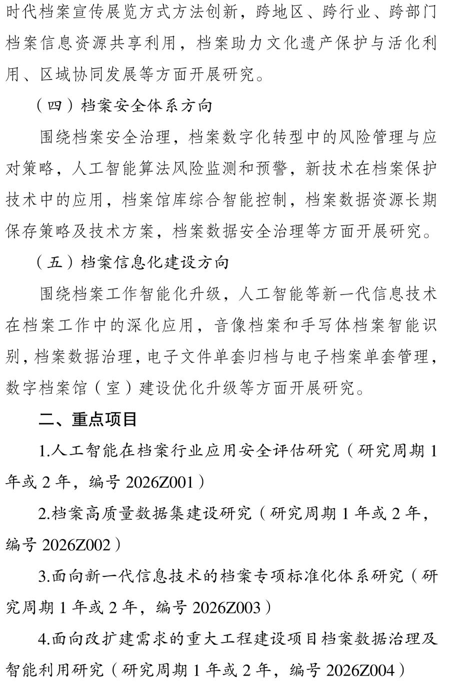 1. 人工智能在档案行业应用安全评估研究 (研究周期1年或2年, 编号2026Z001)