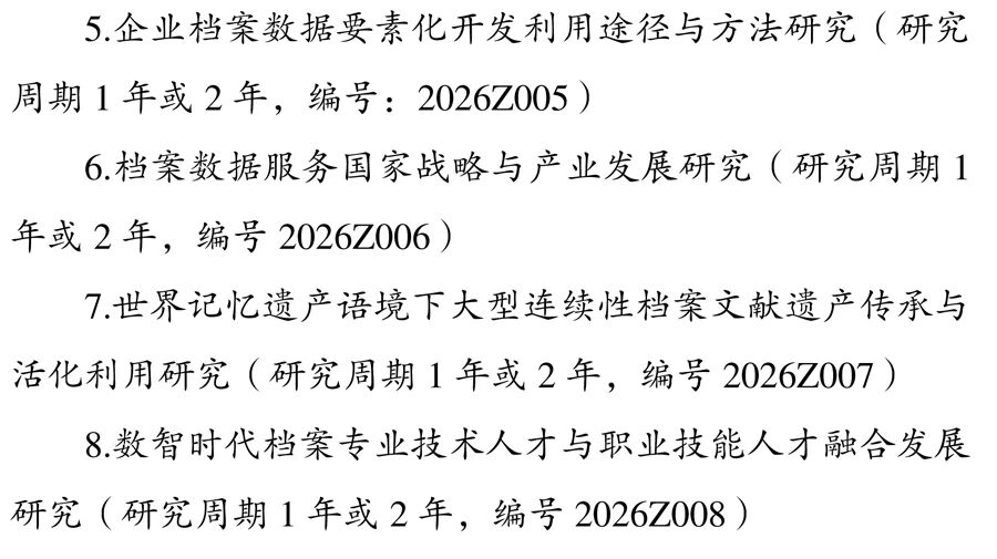 5. 企业档案数据要素化开发利用途径与方法研究 (研究周期1年或2年, 编号: 2026Z005)