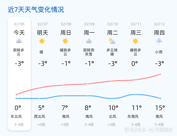 明天2月7日,济宁市天气将转为晴朗,气温有所回升,预计最高气温可达5℃,最低气温为-3℃,风力减弱至西北风<3级,市民可以期待一个晴朗的周末。