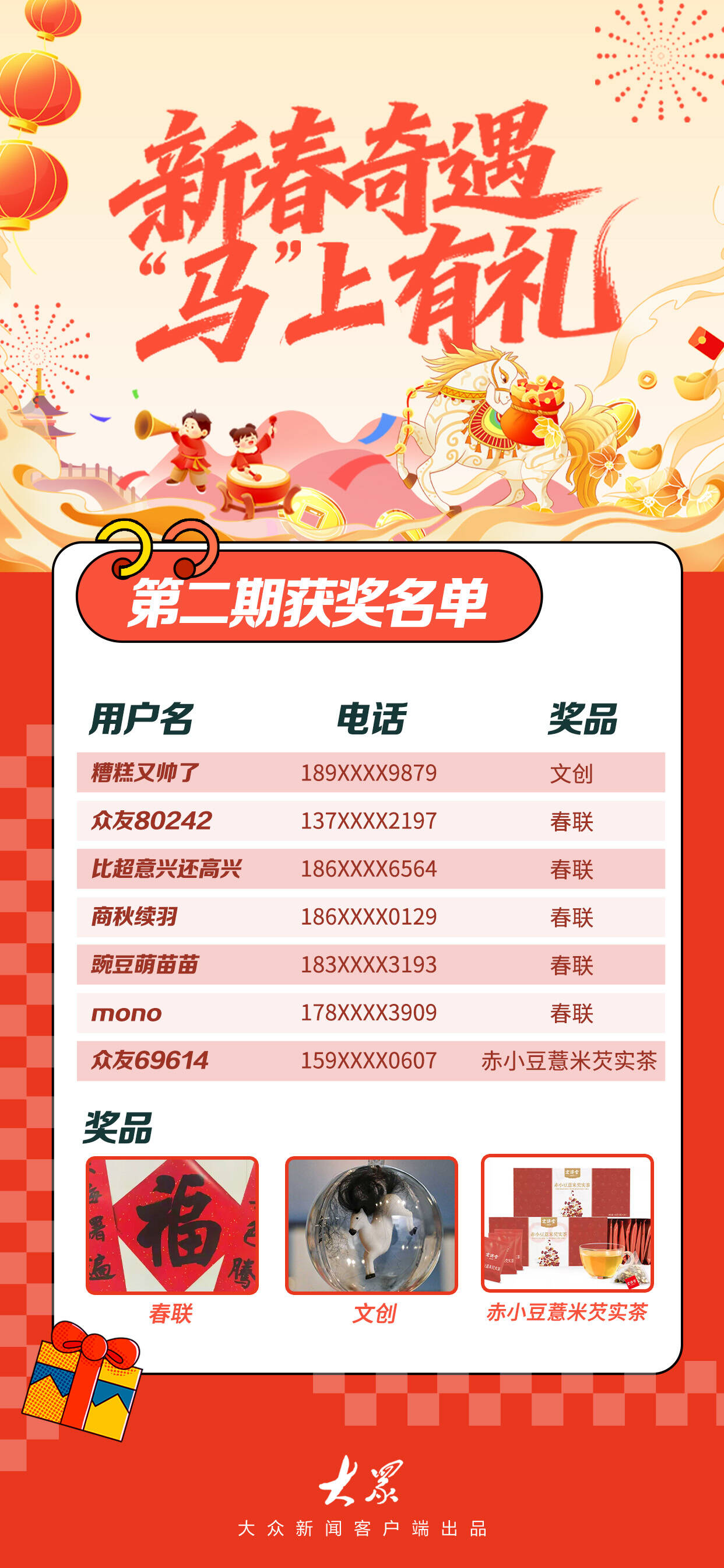 2月6日,大众新闻客户端“新春奇遇”评论有奖活动第二期名单正式公布。温馨提示:每日阅读标有“新春奇遇记”的文章,在评论区畅所欲言、分享观点,留下10字以上评论,就有机会赢取大众新闻定制的新春专属礼品!点击即可一键直达今日文章:新春奇遇记|不只“马彪彪”!山东“神驹”文创,把新年祝福安排明白了相关链接:新春奇遇,“马”上有礼